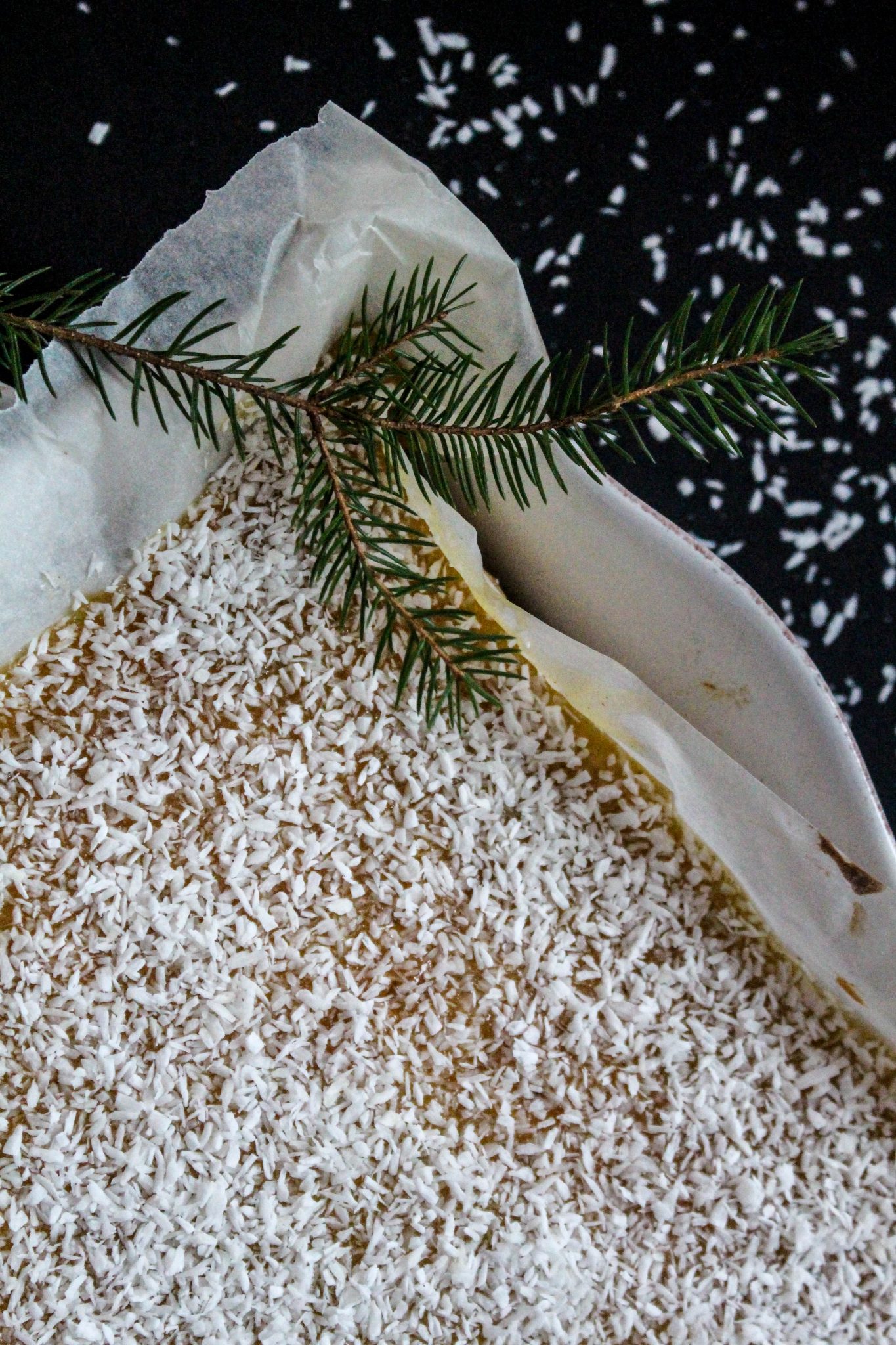 6) Häll på glasyren på kakan när den svalnat helt, bred ut den över hela. Toppa med kokosflingor.