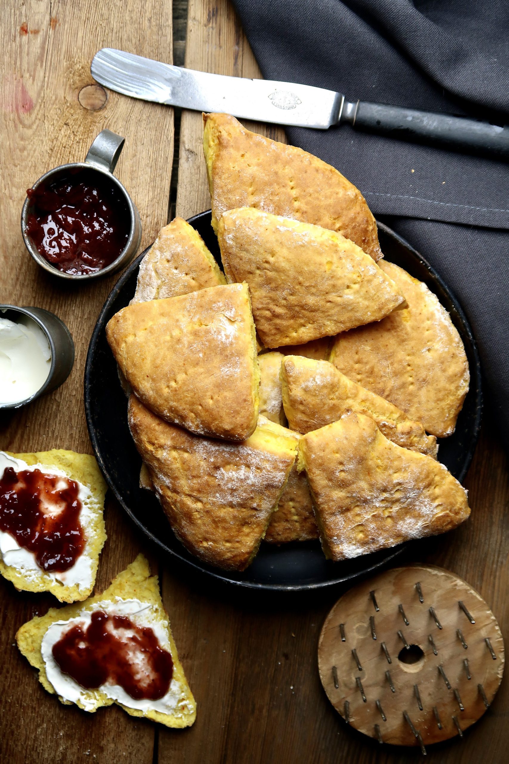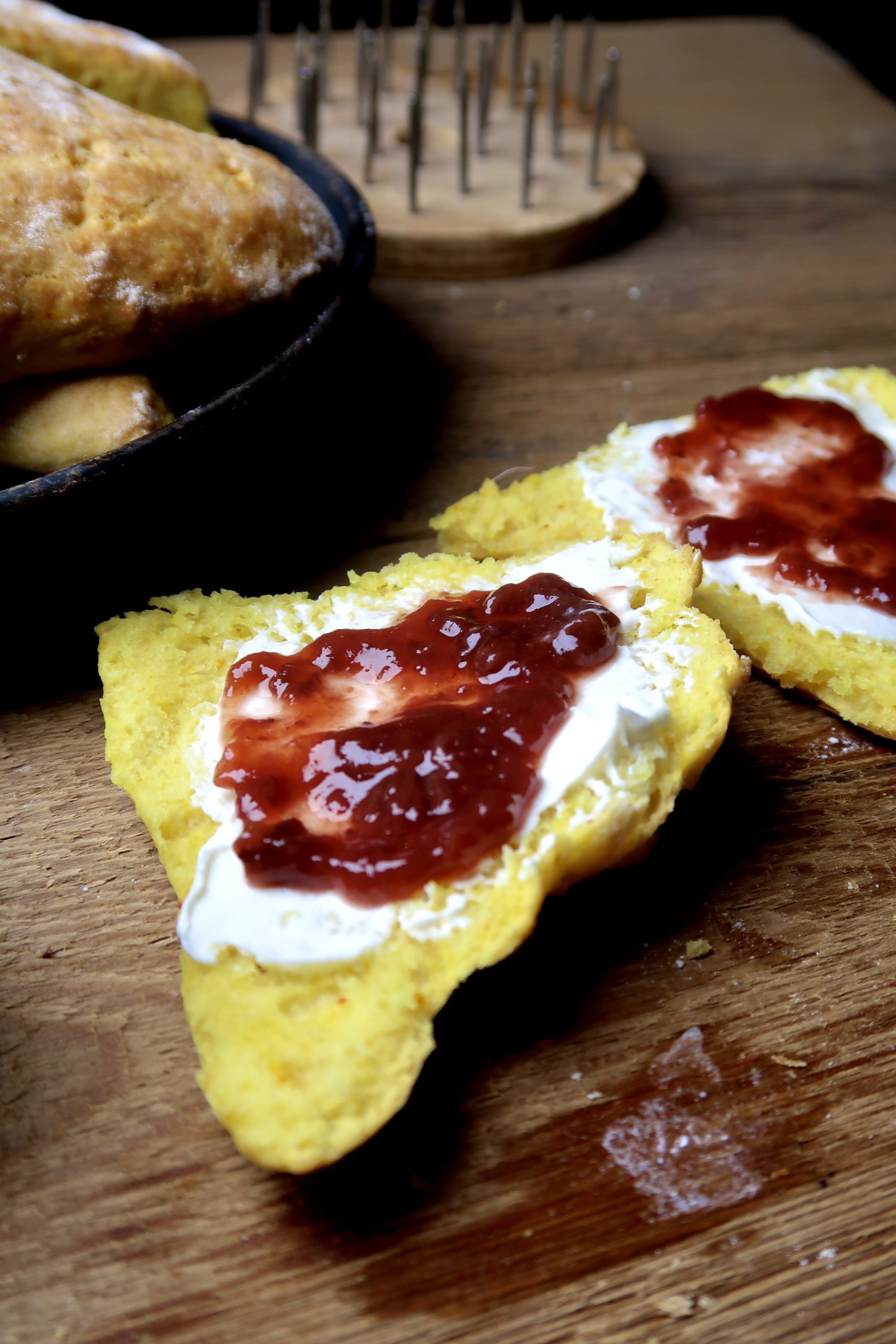 5) Skjuts in i mitten av ugnen. Grädda i 8 minuter, öppna luckan de 2 sista minuterna. Låt svalna en liten smula och servera med cream cheese och sylt. Sååå gott!