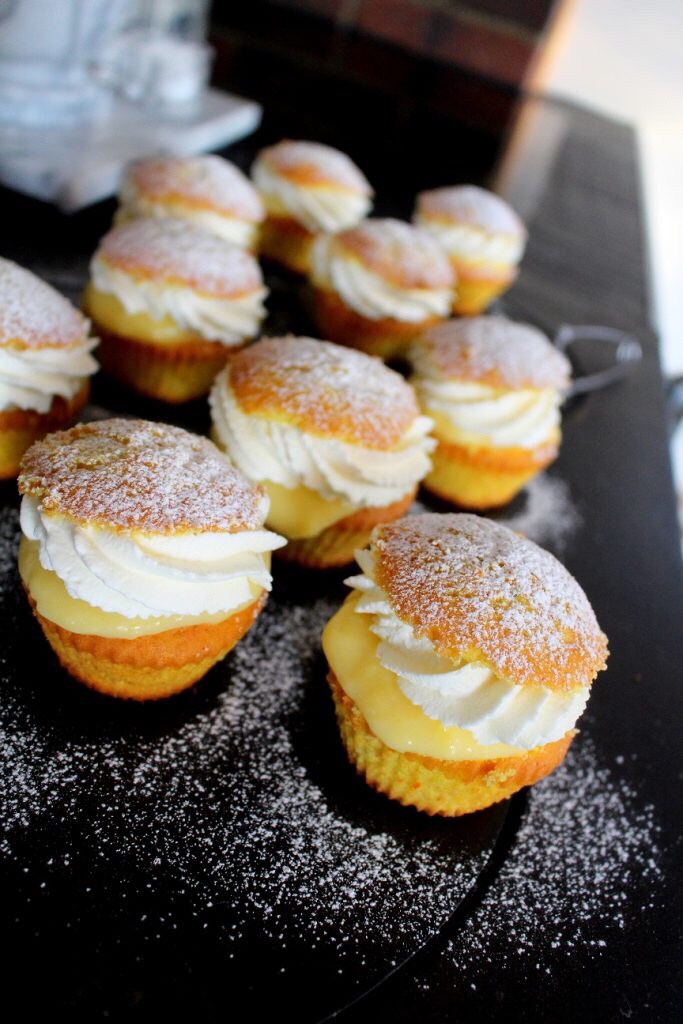 6) Låt muffinsen svalna helt. Skär av toppen på muffinsen och fyll sedan med vaniljkräm och vispad grädde. ÄT OCH NJUT!