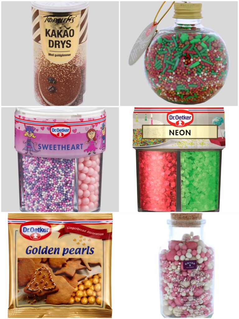 Kakaopulver guldglitter // Julströssel // Rosa strösselmix // Neon strösselmix // Guldkulor // Rosa strössel