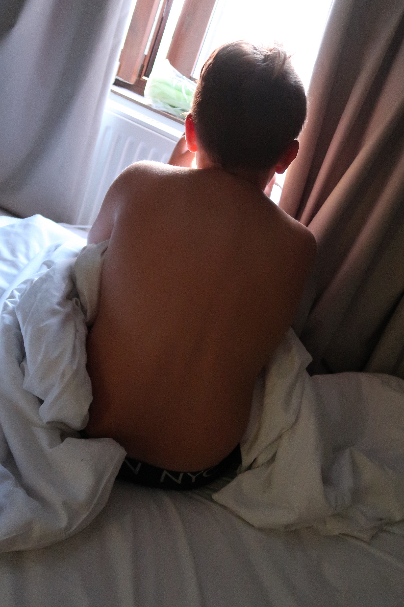 En nyvaken pojkes rygg, som man bara vill krama detta pojkbarn alltså. Jag håller i och njuter av att han inte tagit steget ut ännu, det duger fortfarande med mamma och pappa även om vännerna hela tiden blir mer intressanta och viktiga.