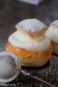 Skär av toppen på bullarna efter att de fått svalna helt. Klipp den gärna i en trekant för att få den lite extra snygg. Gröp ur den nedersta delen lite och fyll med vaniljkräm. Spritsa sedan grädde, lägg på locket och pudra med florsocker. Ät och njut!