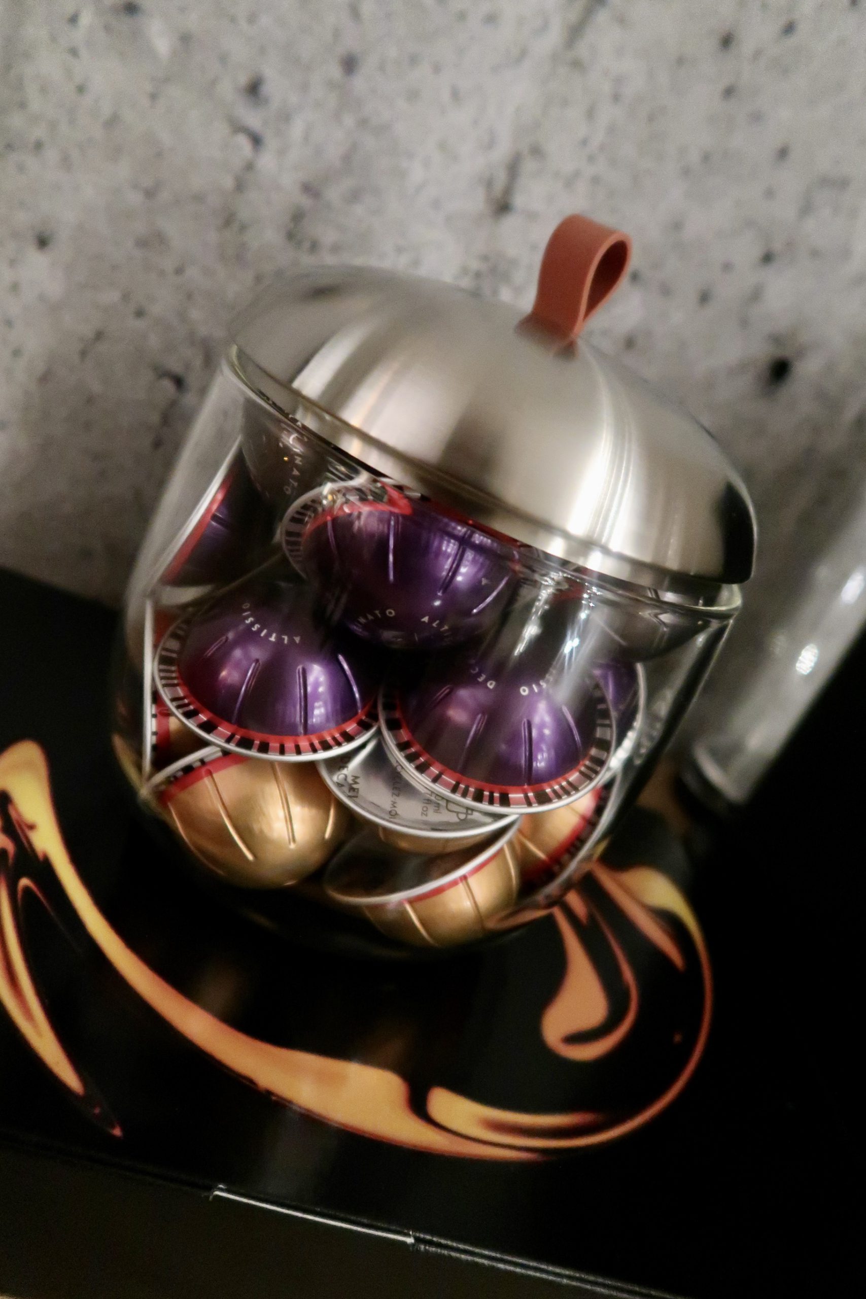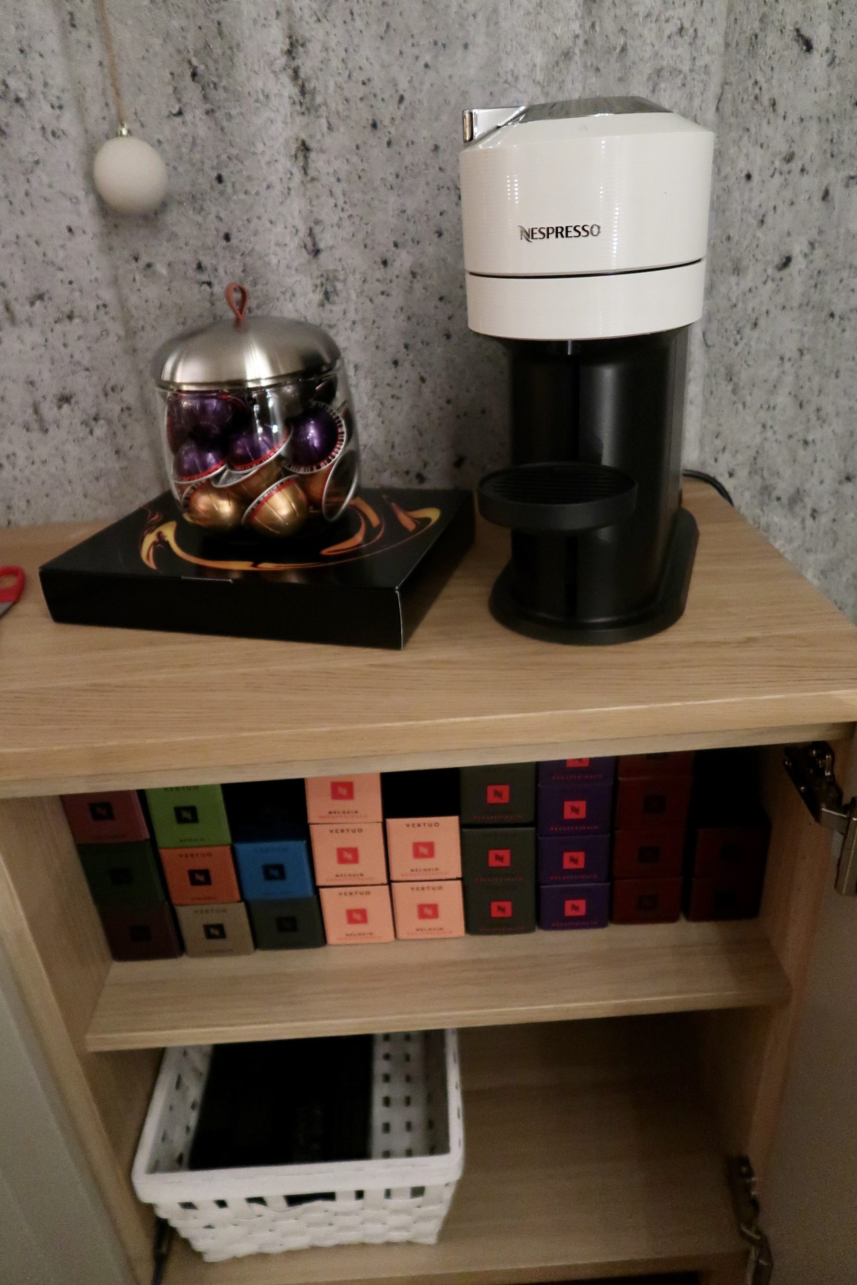 Jag älskar min nya kaffestation som vi har här hemma. Nu står även den andra Nespresson där, den ”vanliga”. Ja för den ville jag ju inte kasta. Dock så använder jag bara Nespresso Vertuo Next hela tiden, alltså den nya. Såååå gott kaffe och fler sorter koffeinfritt att välja på. Jag är sååå nöjd med den här maskinen. Finns HÄR om du är intresserad av en likadan, var 35% rabatt på den nu. Letade även efter den fina kapselbehållaren men den verkar vara slutsåld.