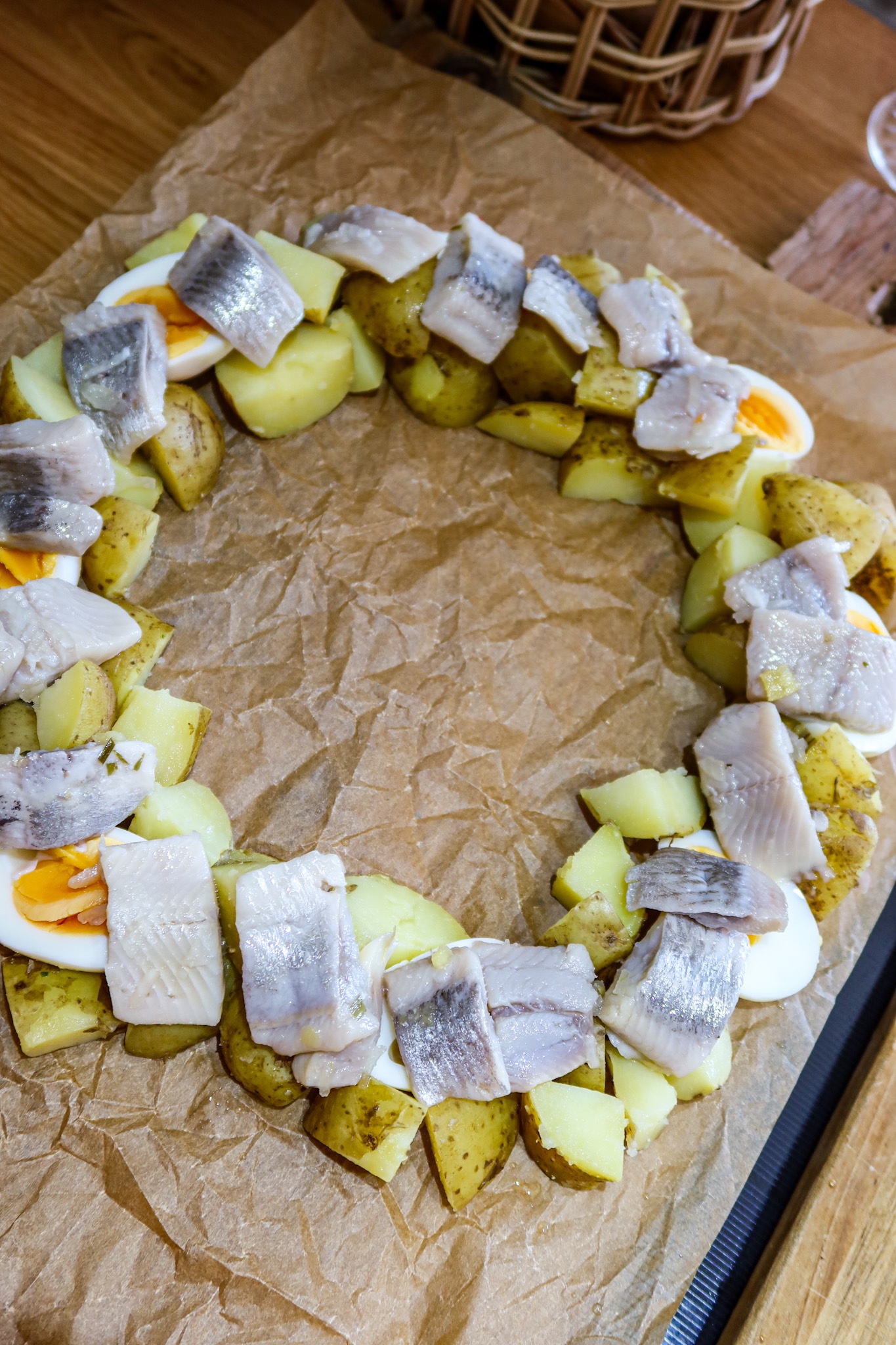 2) Koka äggen och potatisen. Dela äggen på mitten. Dela potatisen i fyra. Ta t ex en träskärbräda och lägg ut ett bakplåtspapper på den. Fördela ut ägg, potatis och sillbitar.