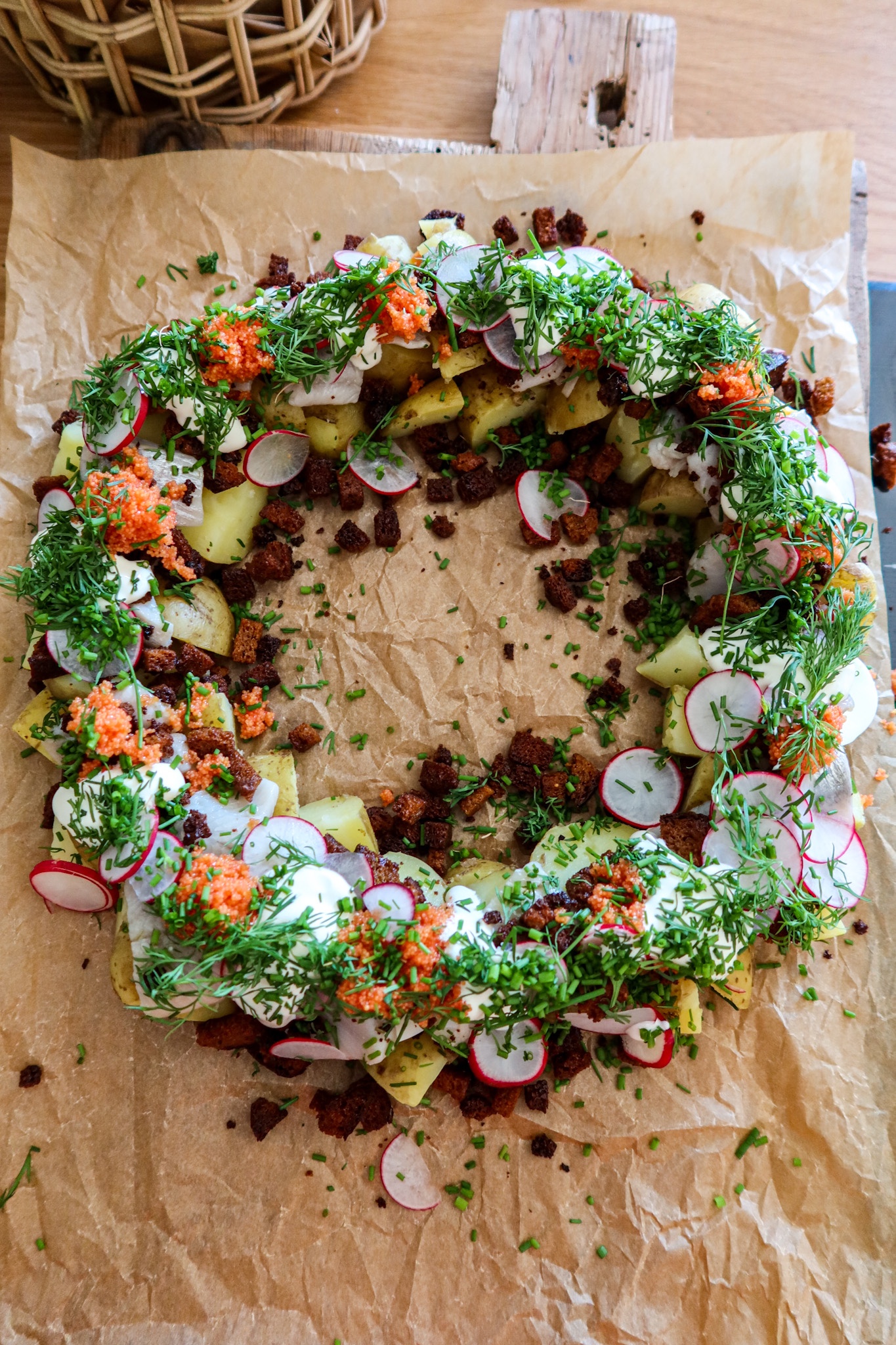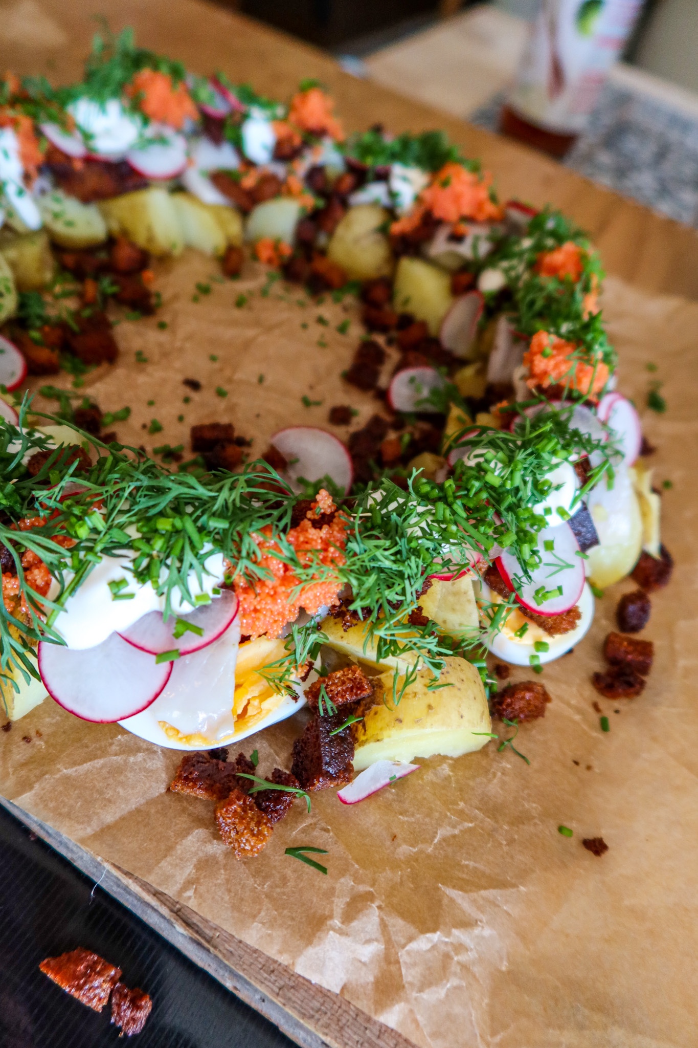3) Skiva rädisorna i tunna skivor. Hacka dill och gräslök. Lägg på den stekta kavringen över hela kransen, fördela sedan ut rädisor. Klicka på creme fraiche lite här och var, klicka även ut stenbitsrom.