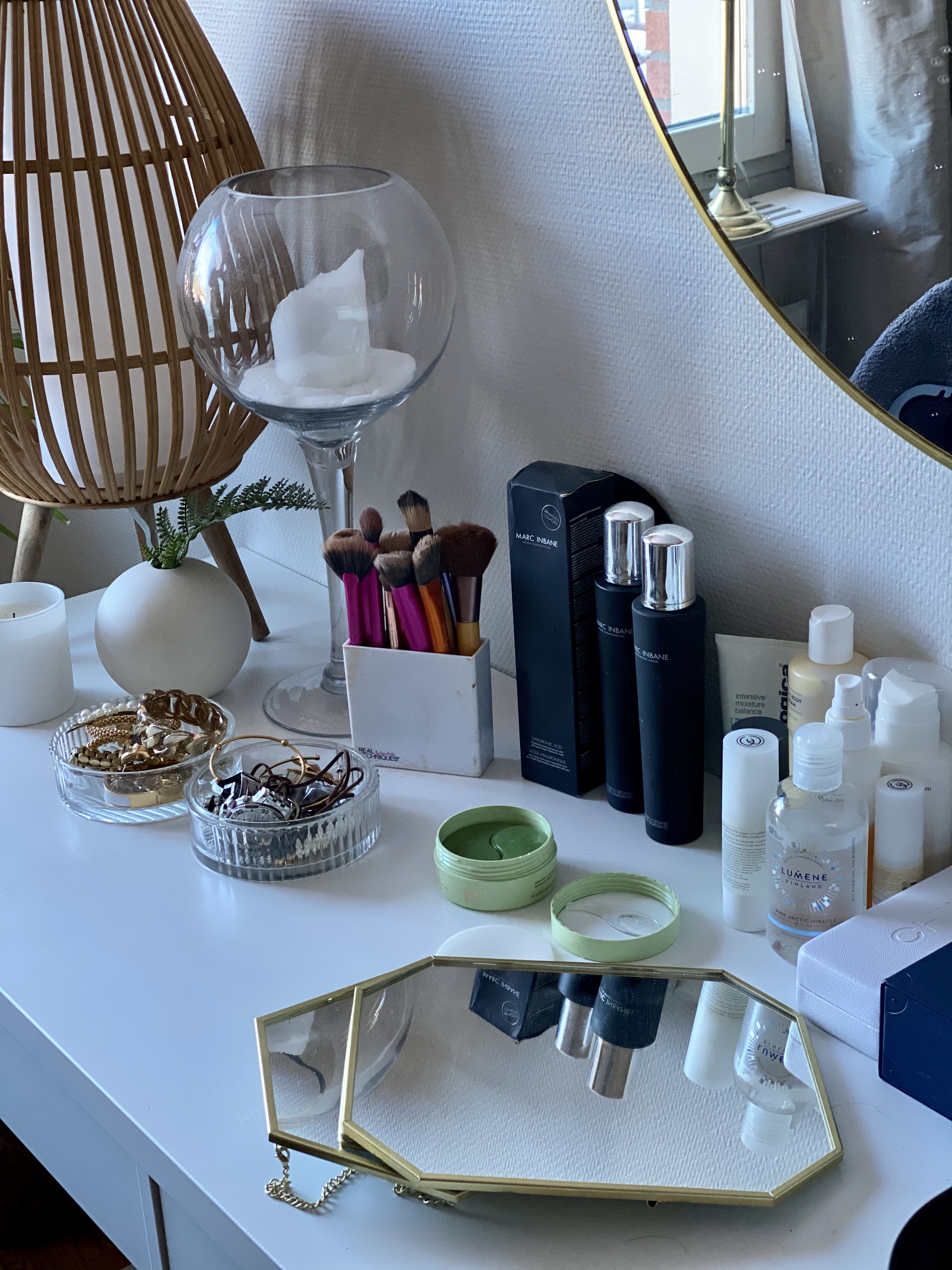 Ska också fortsätta ta tag i mitt sminkbord här hemma. Har flyttat in allt smink & skönhet hit nu och behöver fixa så det blir praktiskt, bra och fint. Tar bättre bilder sen när jag är klar. Så mys och sitta ned här i lugn och ro och föna håret, locka det och sminka sig här. Inte stå i ett badrum med dålig belysning och noll myskänsla.