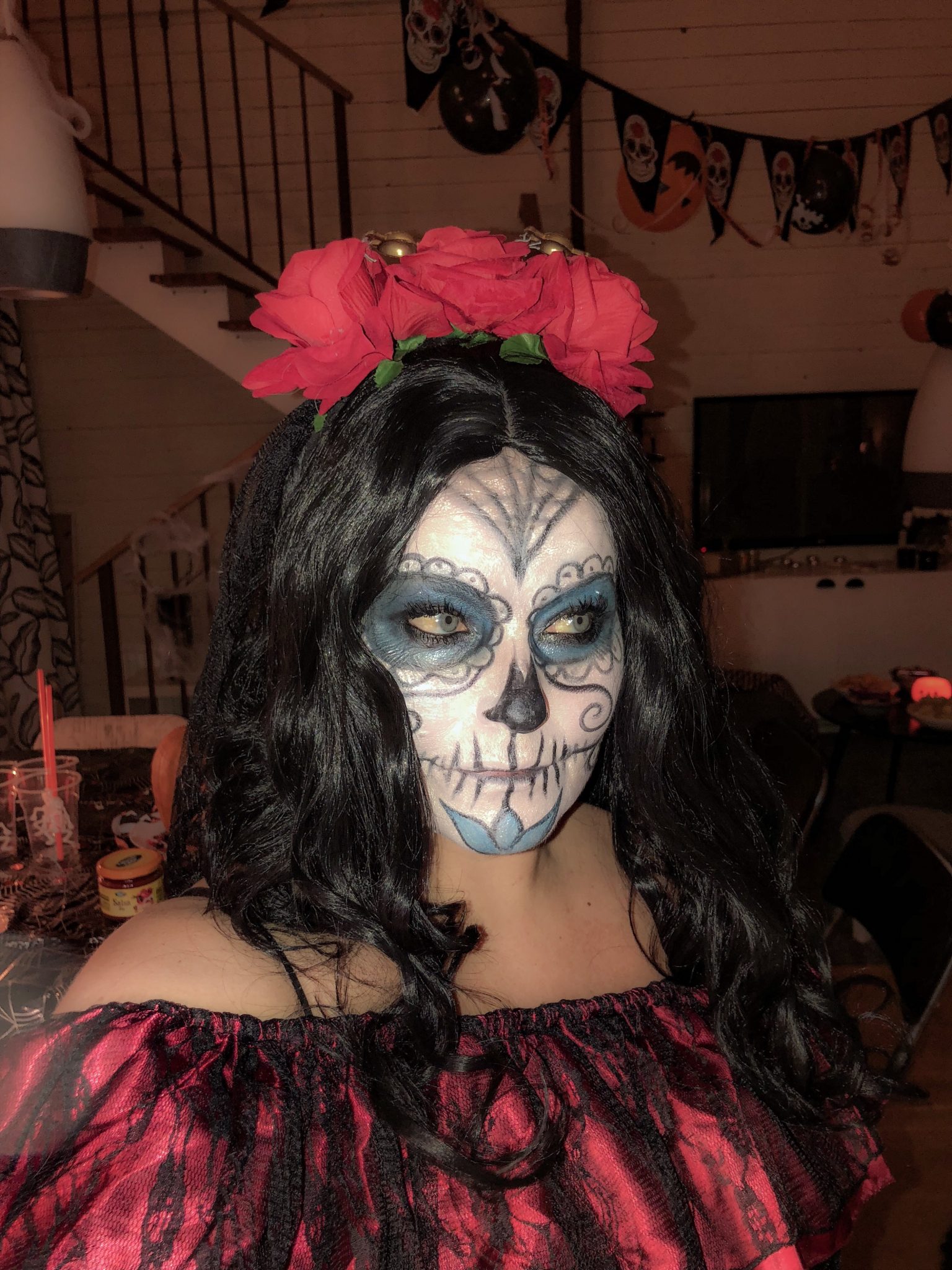 Stressad men färdigsminkad. Haha….vilket jobb, haha. Har aldrig sminkat mig till en sugar skull och det var inte det lättaste. Men något fick jag ihop i alla fall…. Tony fastnade inte ens på bild och hans kostym som var så otroligt cool.