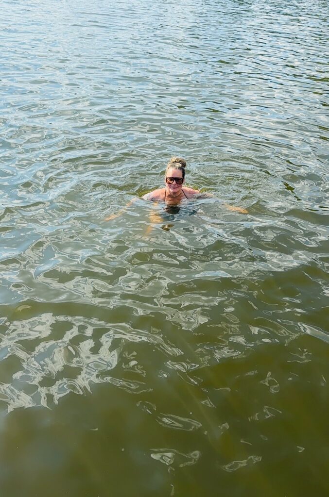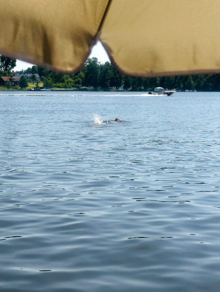 Jag har läst på massor om det. Forskning visar faktiskt också att simning i naturligt vatten, särskilt sjöar och hav, har flera lugnande och läkande effekter på kroppen. När du simmar aktiveras det parasympatiska nervsystemet (det som kallas “rest and digest” – så fiffigt namn ju för det är exakt det den gör), vilket kan sänka kortisolnivåerna (stresshormonet) och hjälpa kroppen att gå från kamp och spänning till vila och återhämtning.