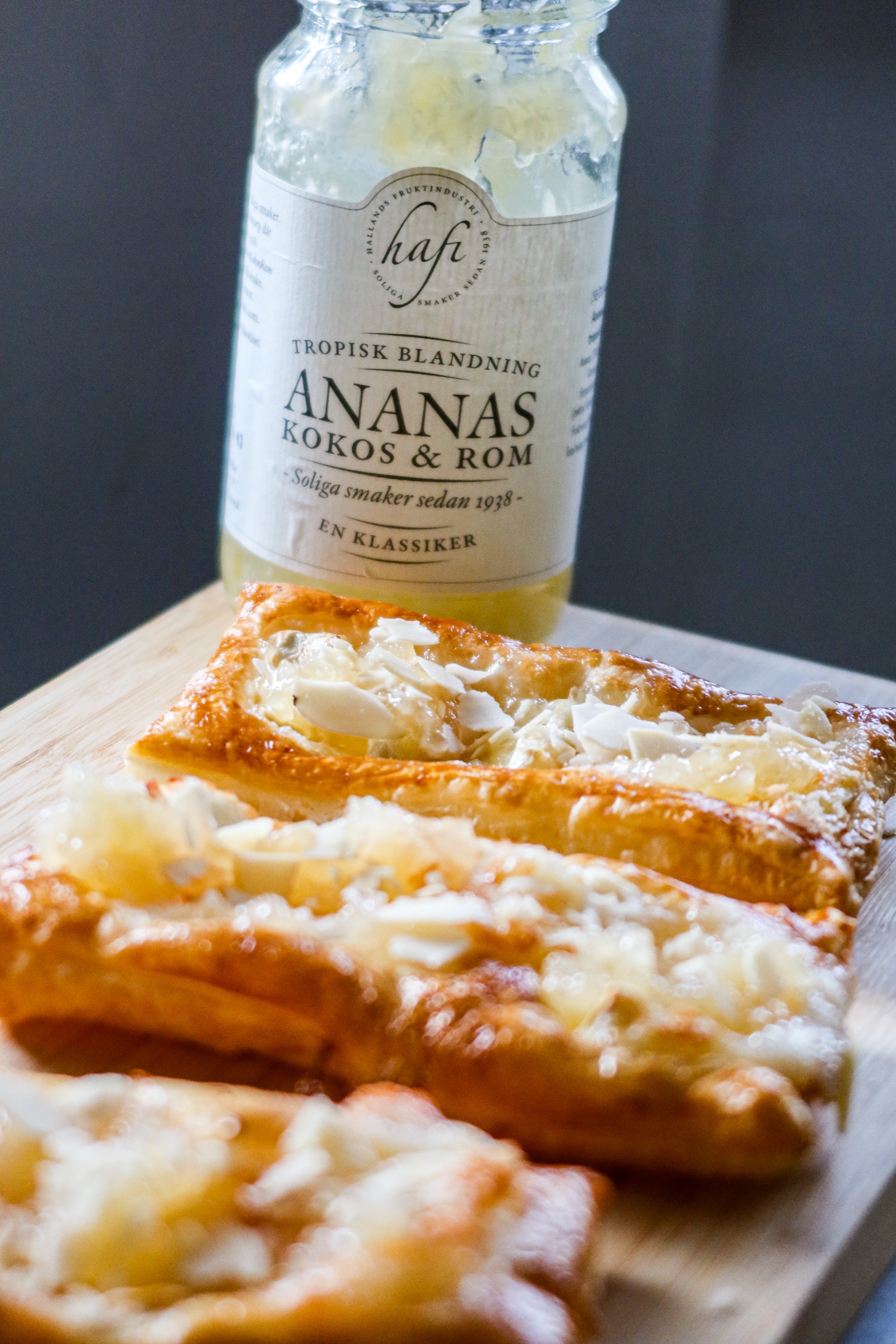 SMÖRDEGSPUFFAR MED CHÈVRE OCH ANANAS/KOKOS/ROM MARMELAD.