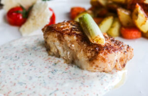 Denna smörstekta torskrygg serverades med romsås, rostade rotfrukter och sen blev det även parmesanchips och ugnsbakad tomat.
