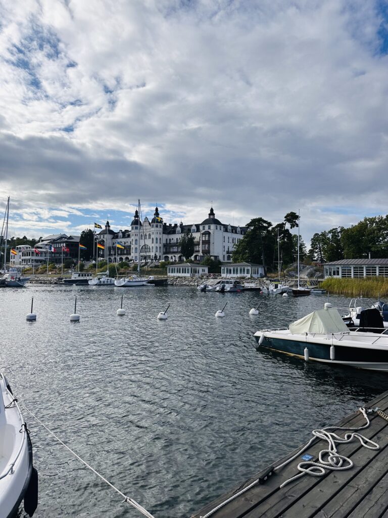 Här tog vi den där mysiga promenaden runt Restaurangholmen som det heter. Du går precis bredvid vattnet, en alldeles lagom lång promenad. Hamnen med båtarna passerar man och så ser man vackra Grand Hotel Saltsjöbaden på håll.