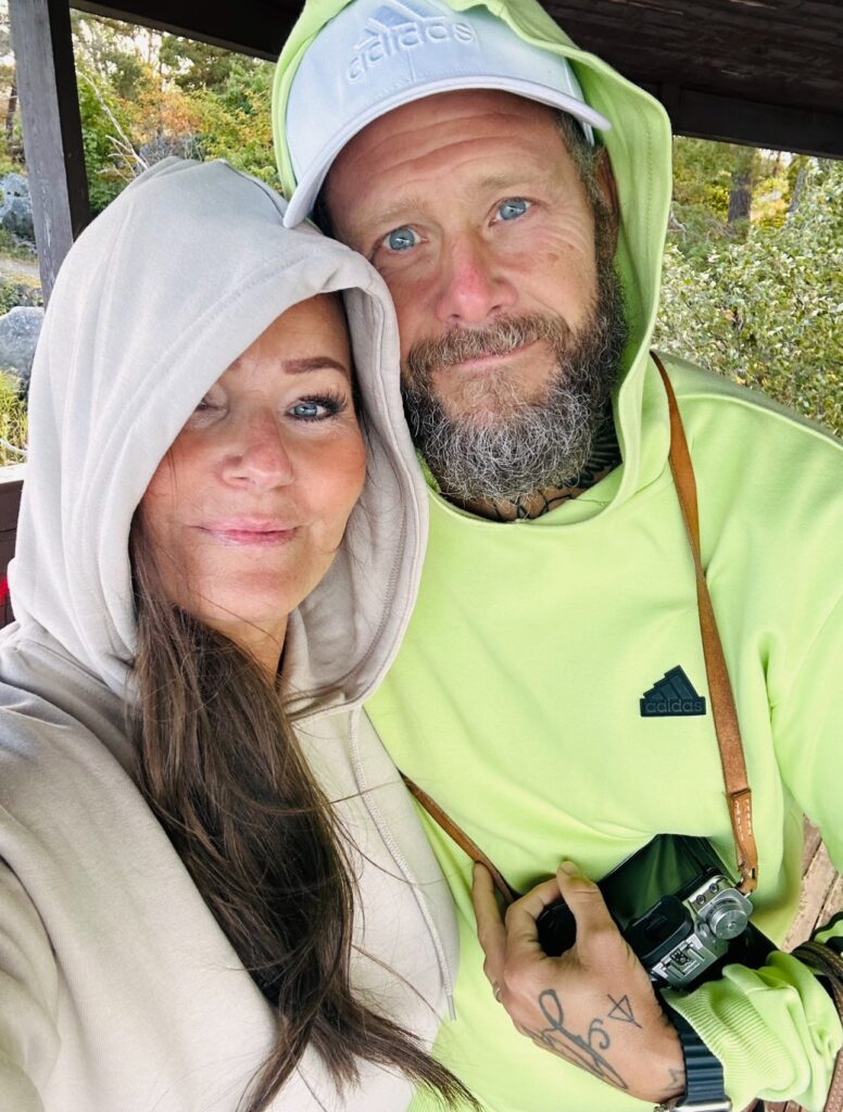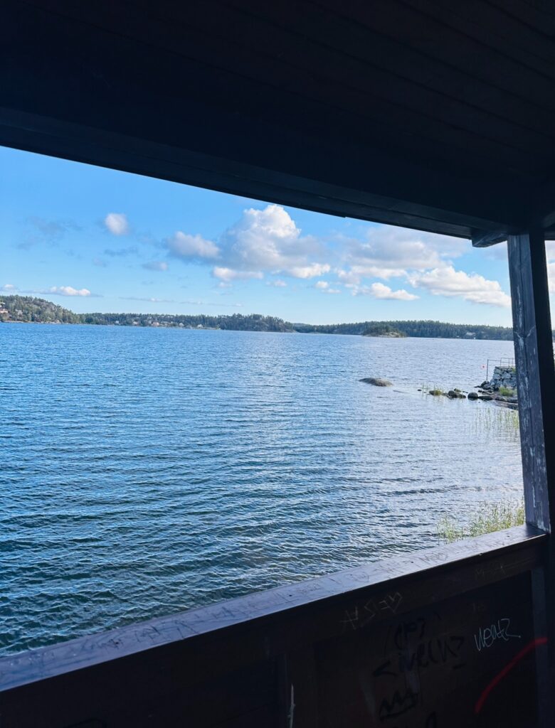 Tony passade på att gå runt och fota lite och så kunde man klättra upp i detta utsiktstorn på vägen. Utsikten var magisk. Här stod vi och kikade ut över vattnet. Så idylliskt med den puttrande båten som just passerade. Sverige är bra jädra vackert hörni!