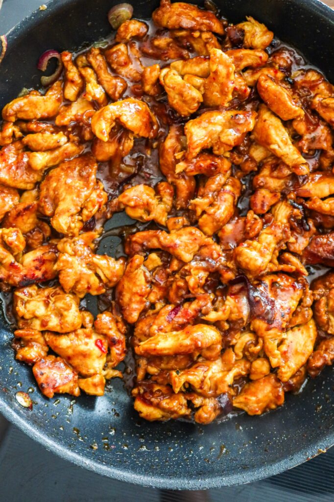 4. När kycklingen är klar, ha i sweet chilisås, soja och chiliflakes.