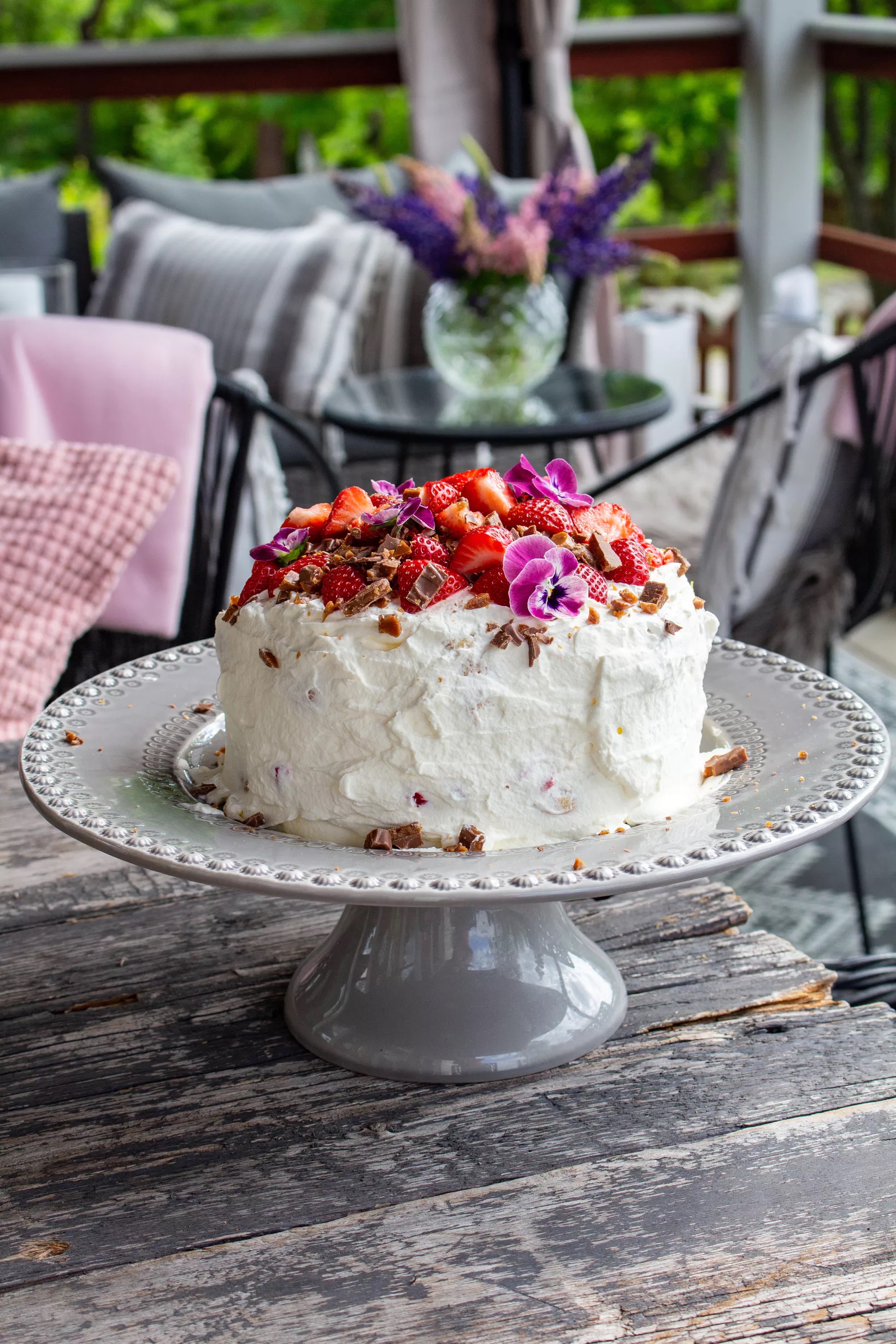 4) Toppa med jordgubbar och hackad Daim. Ha gärna på ätbara blommor också. Sååå gott och vackert!