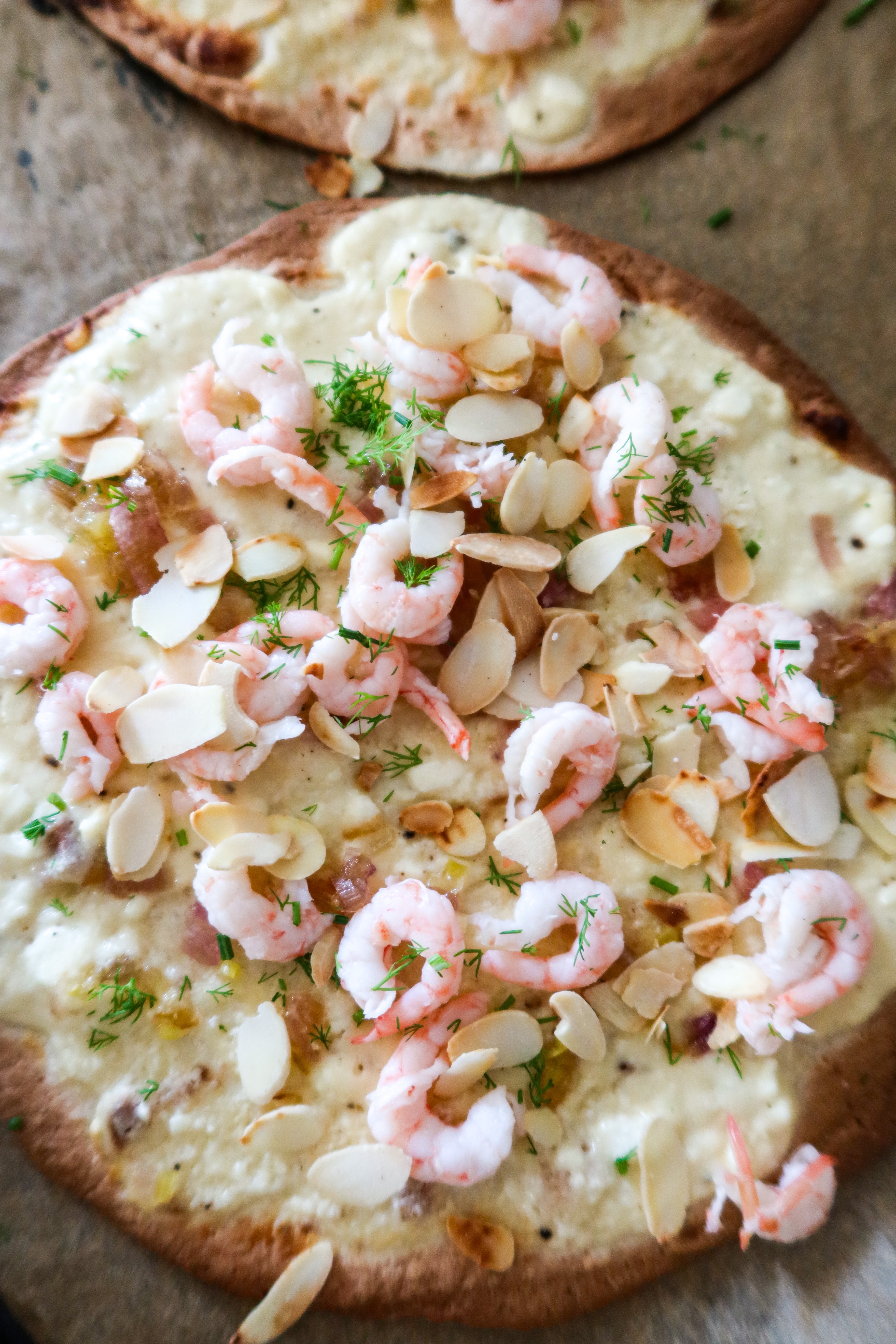 4) Lägg på färska räkor, mandelflarnen, karamelliserad lök, klicka på fetaostkräm och klipp till sist på dill. Vik ihop en gång och njut. Så sjukt gott!
