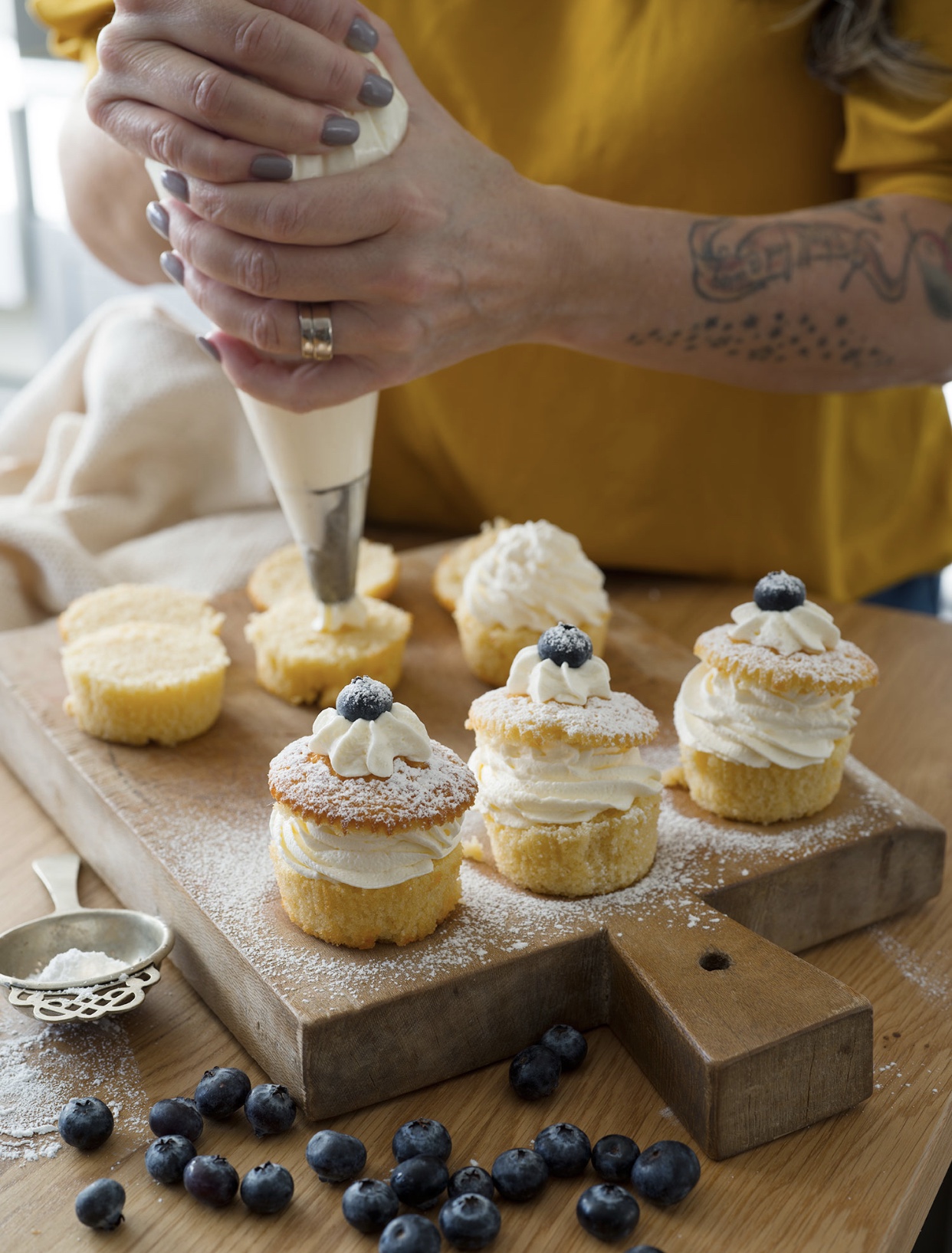 4) Skär toppen på varje muffins. Vispa grädden och spritsa ut den på muffinsen. Lägg på locken och spritsa på ytterligare lite grädde. Lägg på blåbär, pudra med florsocker och servera.