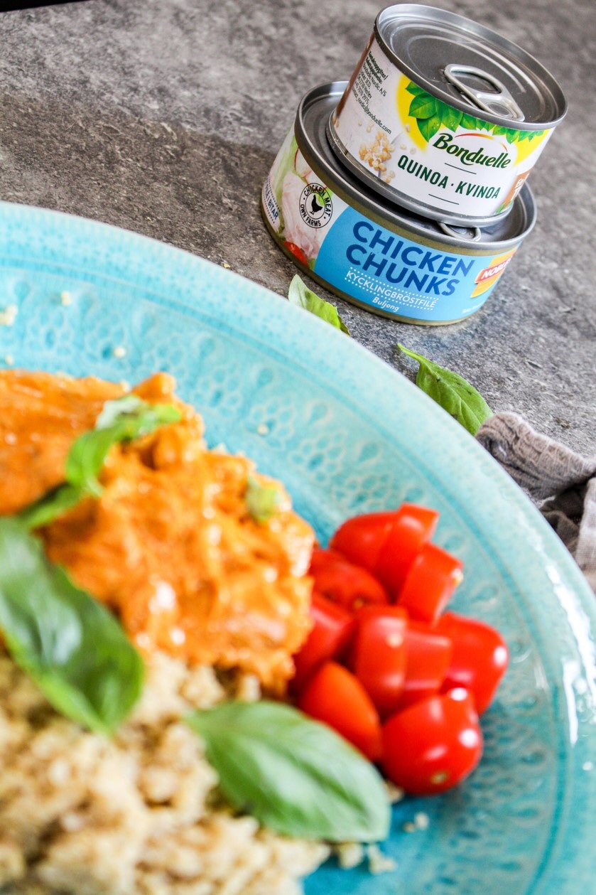 Något som jag alltid har i kylen är konserverad kyckling och quinoa. Låter kanske skitäckligt med konserverad kyckling men det är kanske det smartaste påfundet ever! Dessutom goda perfekta kycklingbitar som är klara att äta direkt. Men hur bra? De ligger i en speciell lag så när du öppnar konserven häller du bara ut lagen så är det ”ready to eat”.