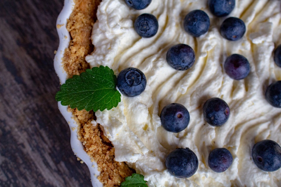 2) Blanda vetemjöl, bakpulver och vaniljsocker. Blanda i det i smeten samtidigt som du häller i yoghurten. Blanda runt till en jämn smet.