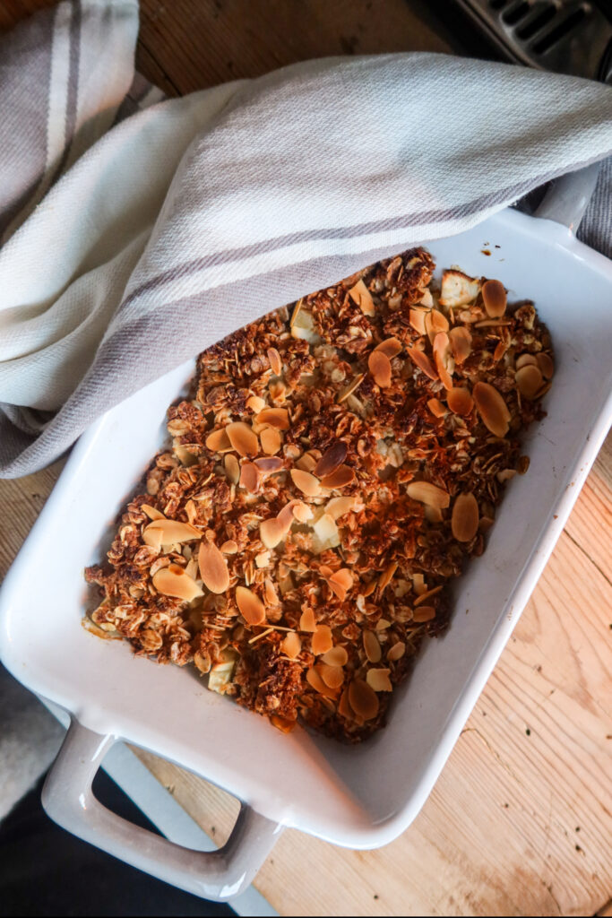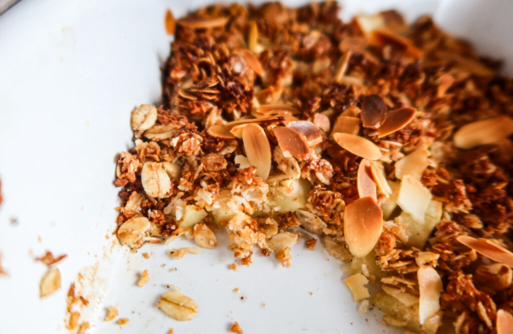 2. Blanda havregryn, kokos, kokosolja, lönnsirap, kardemumma, kanel, vaniljpulver och salt. Detta blir till en smulig massa. Strö på det på äpplena. Toppa med mandelflarn.