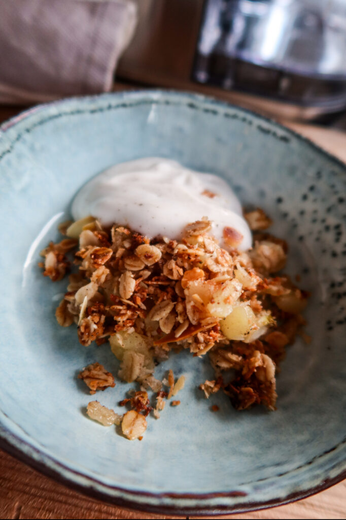 Den blev så himla frasig och god och blev så god till min vaniljsås jag gjorde av kokosyoghurt, lönnsirap och vaniljpulver. Riktigt riktigt gott!