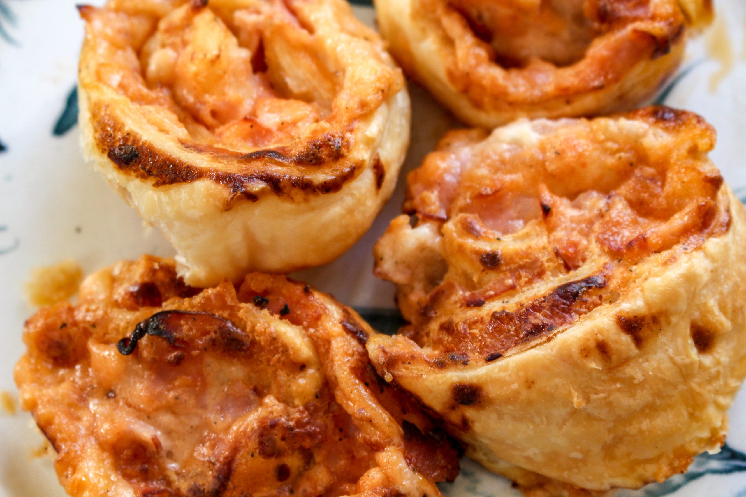 2) Skär skinkan i strimlor, blanda creme fraiche, ost, chilisås, creme fraiche, honung, salt och peppar till en röra. Bred på den på smördegsrullen och rulla sedan ihop hela. Skär i 2-3 cm breda bitar. Lägg sedan i bakformar. Toppa med lite riven ost. Grädda på 200 grader i ca 15 min. De ska få fin färg.