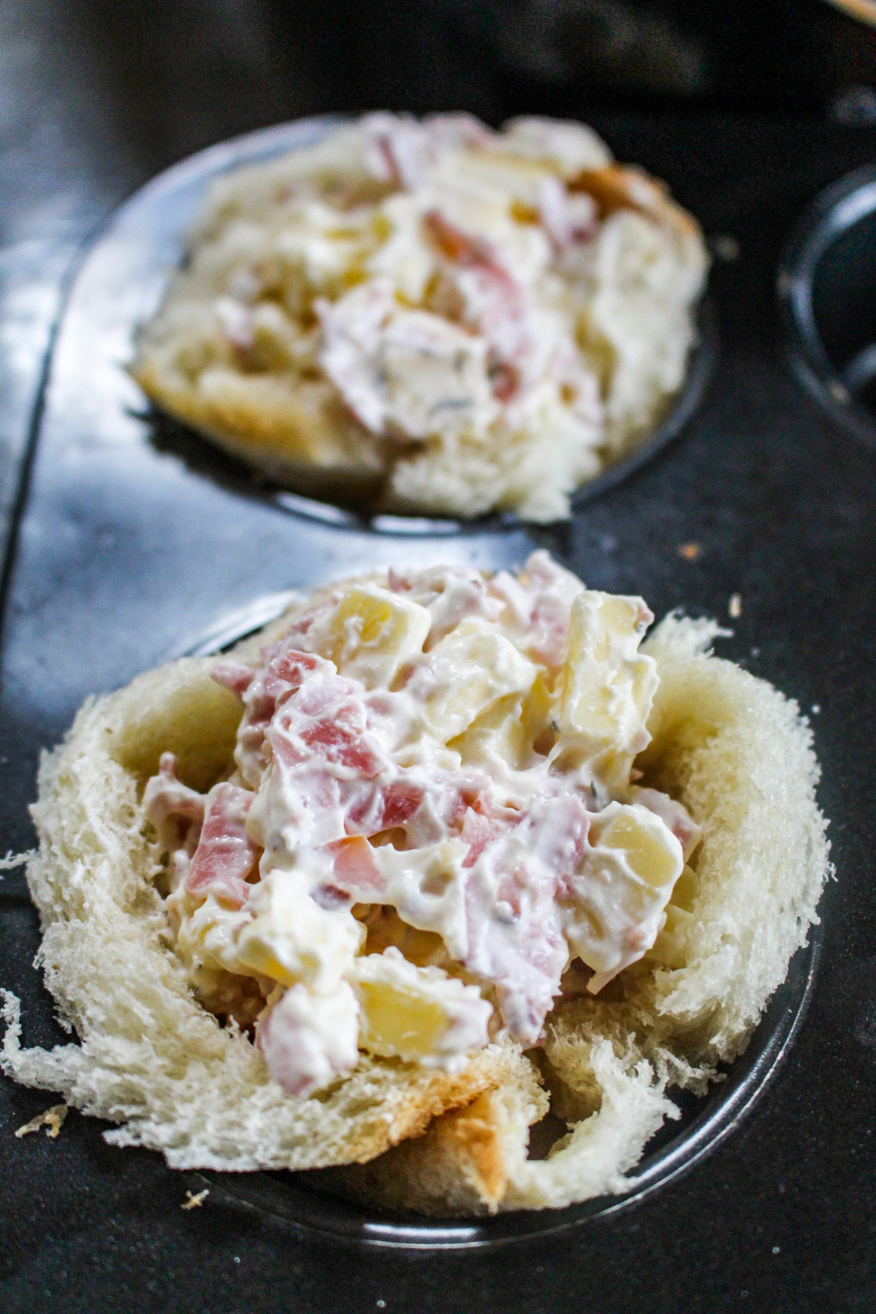 2) Lägg i dem i en muffinsform. Jag pressade brödkanterna så att själva ”hålet” blir ganska så stort.
