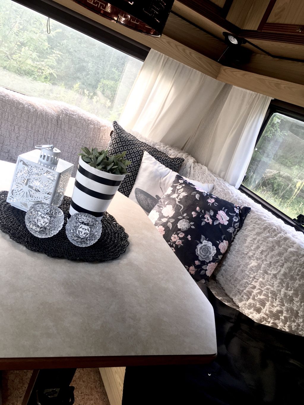 Jag slängde på IKEA plädar som täckte sätena så man slapp de aprikosa dynorna. Slängde också in svarta filtar och lite kuddar. Köpte en liten lykta på Rusta och ljushållare att ha på bordet.