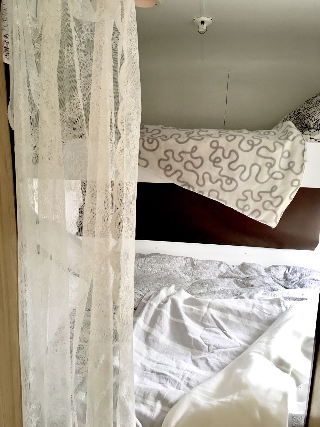Hängde upp en annan gardin, en spetsgardin i vitt (från Rusta). Bäddade också i båda sängarna, med nya sänglakanfrån Cellbes blev så mysigt så. Pläden som egentligen är en duk blev fin på sängen, den är från Cellbes men slut i just den färgen.