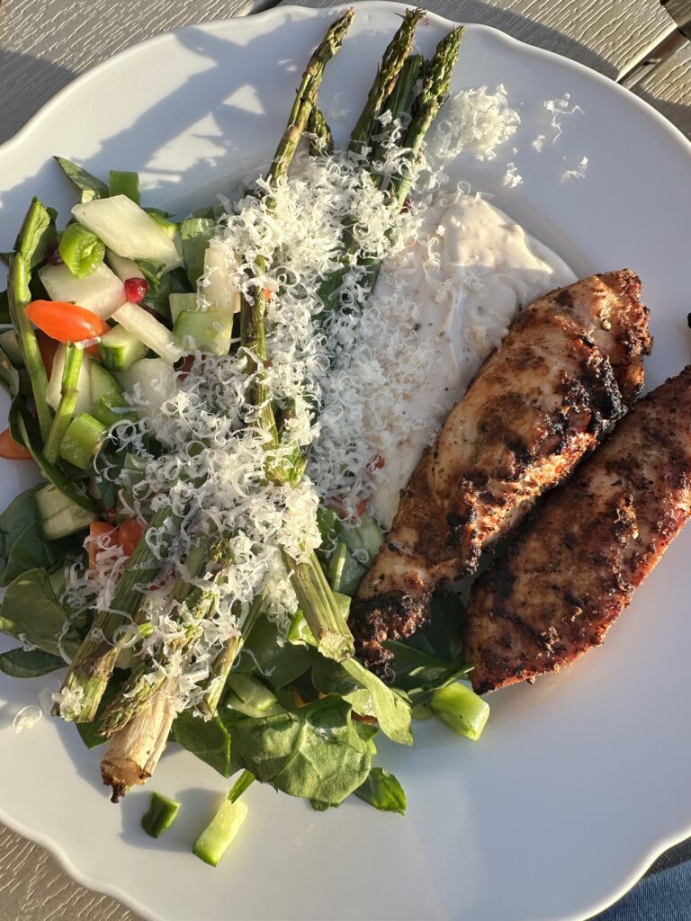 Åt så god grilltallrik här hemma i veckan. Min vitlökssås, grillad kyckling med världens godaste marinad, stekt sparris med citron och parmesan och en riktigt härlig sallad till.