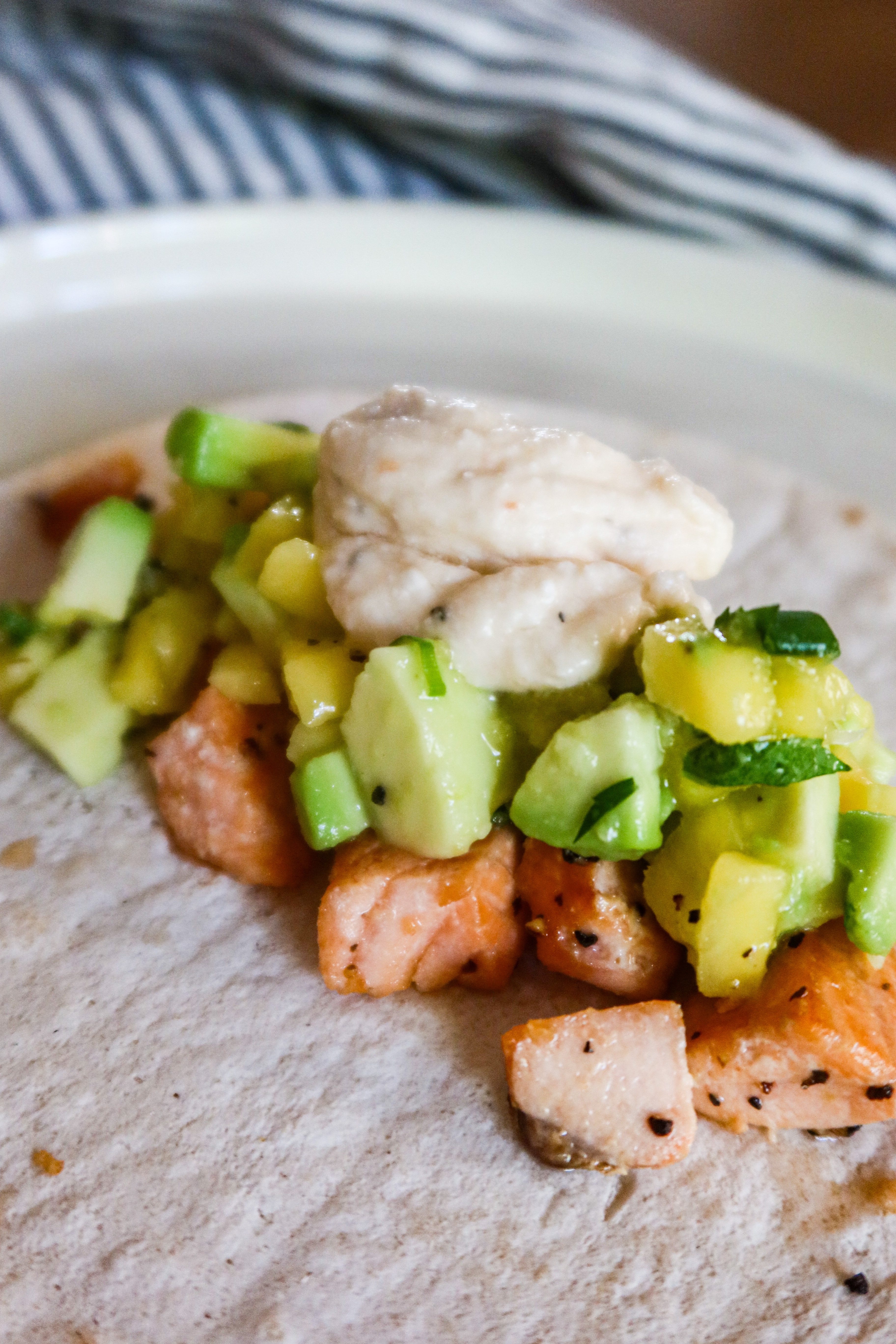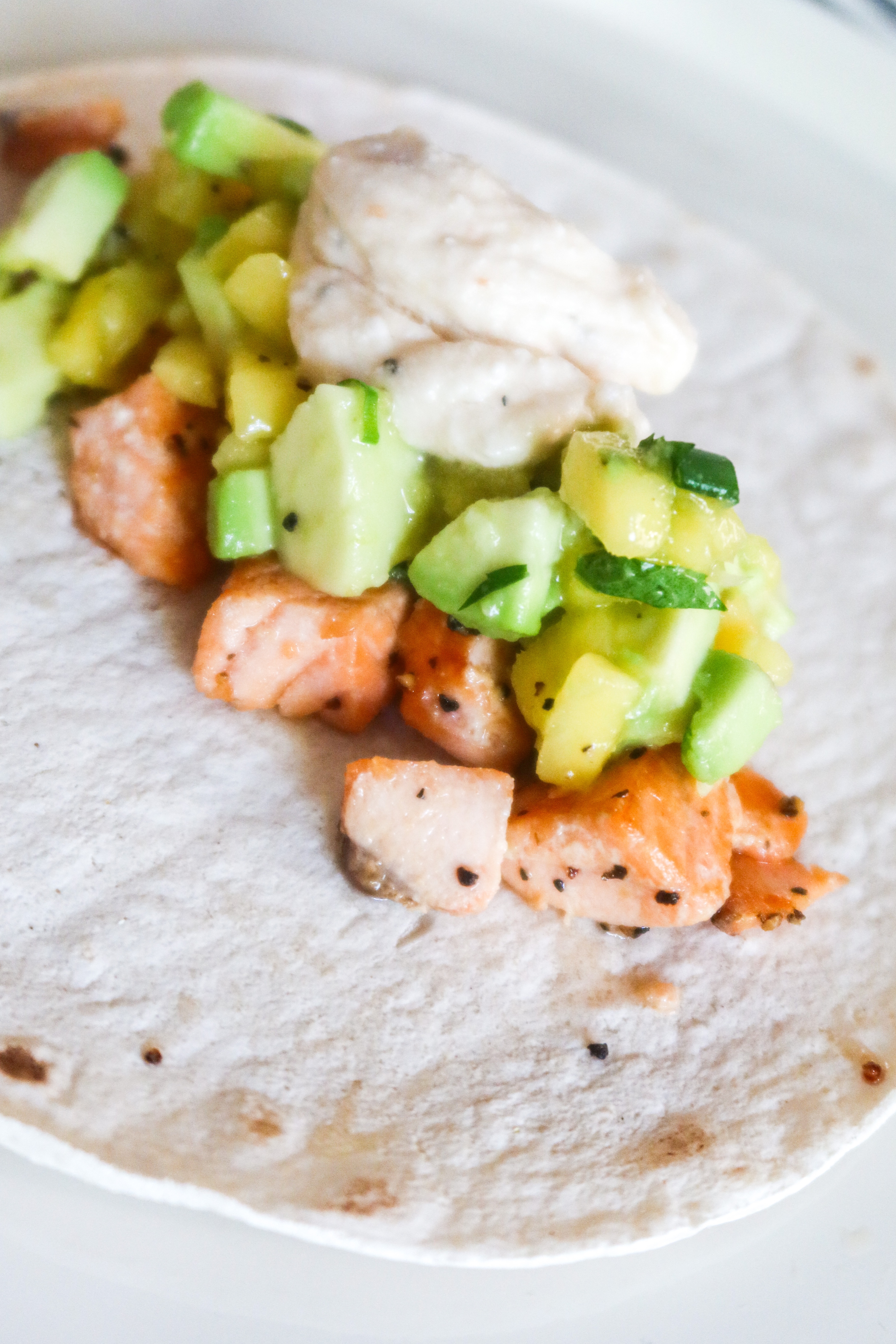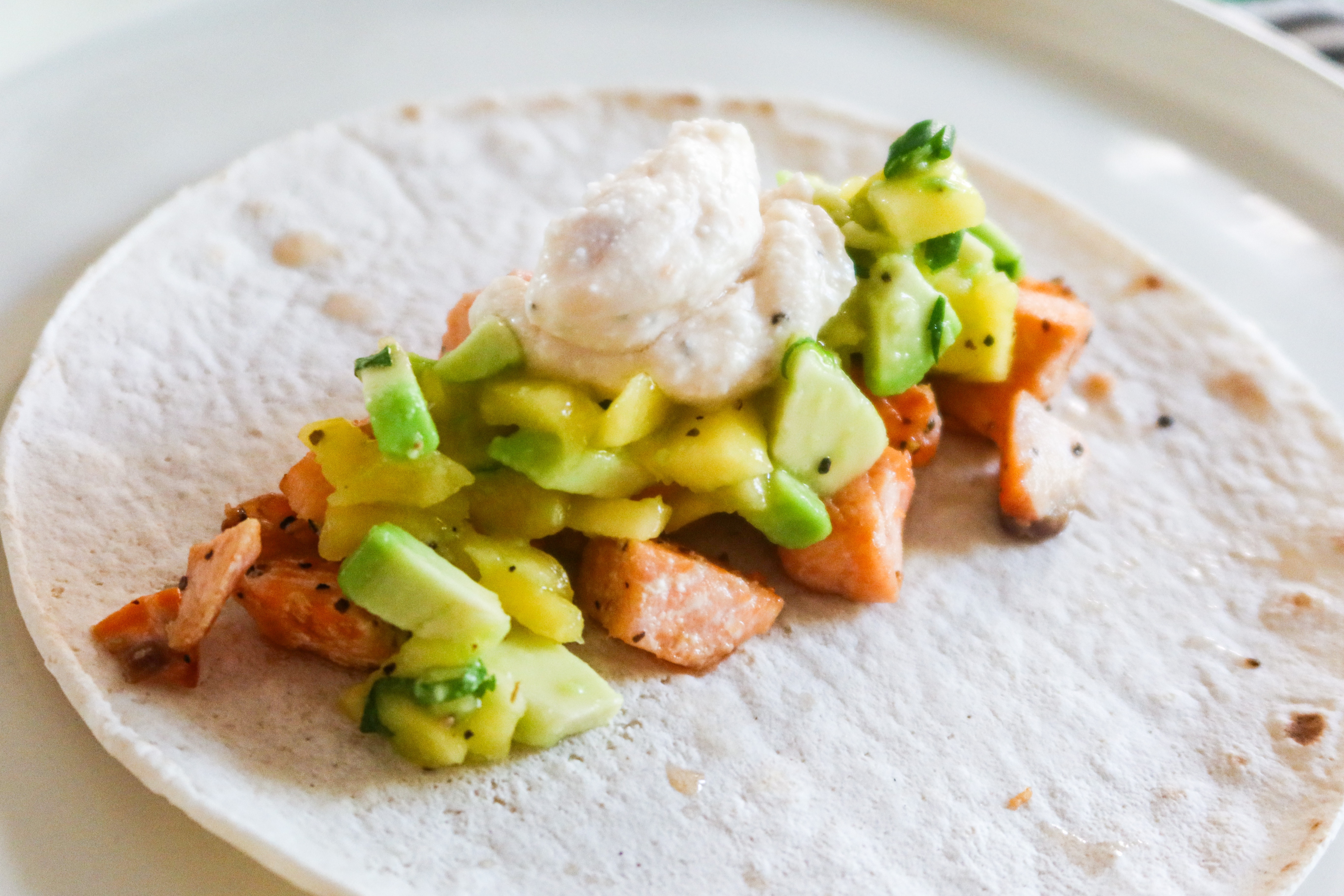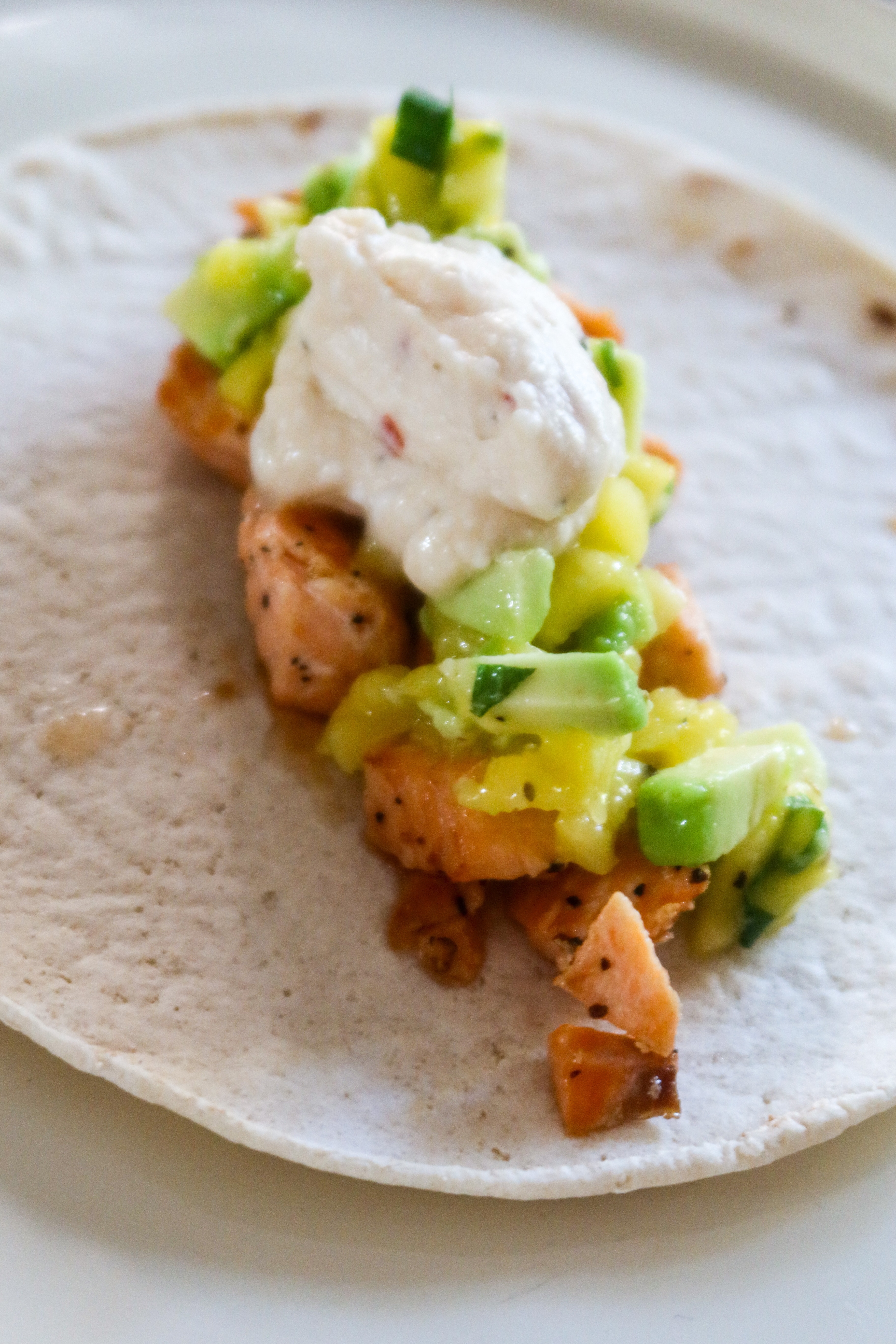 4) Ta ett tortillabröd, på med grillad lax, mangosalsan och så såsen över. Så gott!
