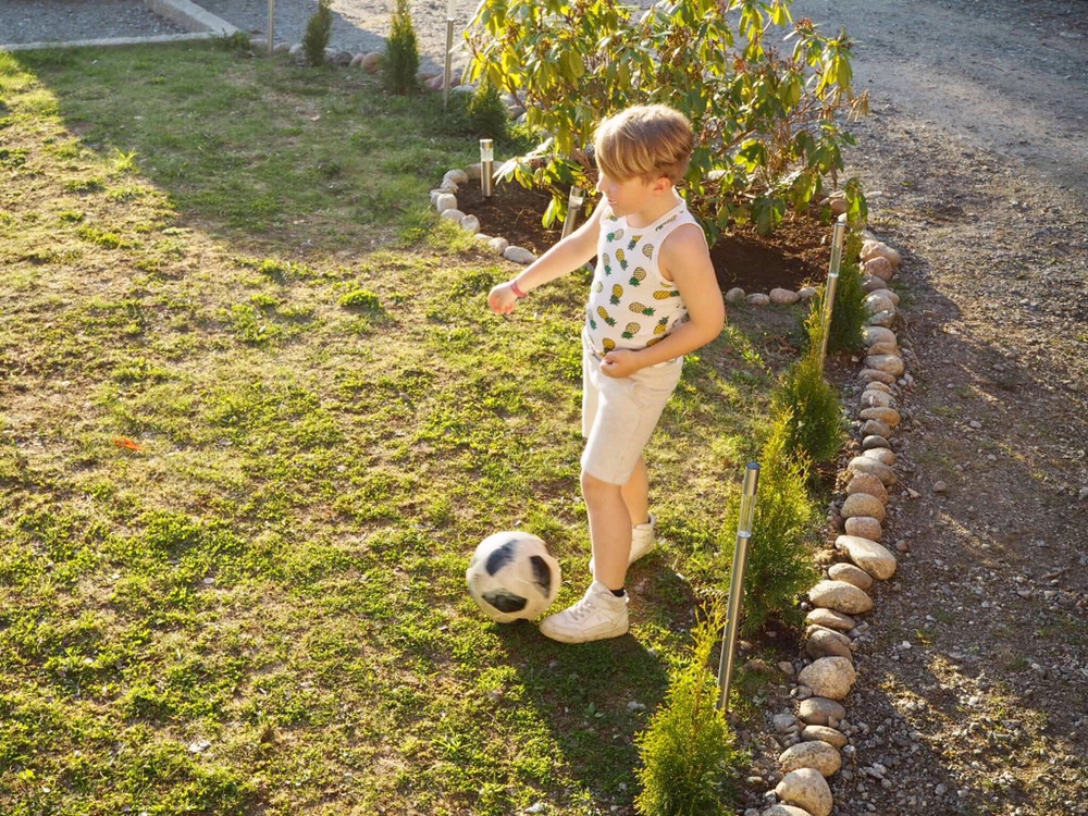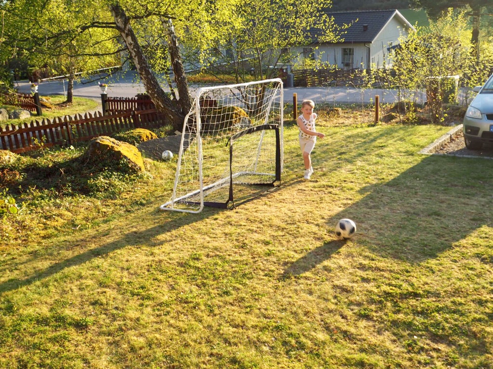 När vi kom hem åkte ananaslinnet och shortsen på. Sen var det ut och spela boll som gällde.