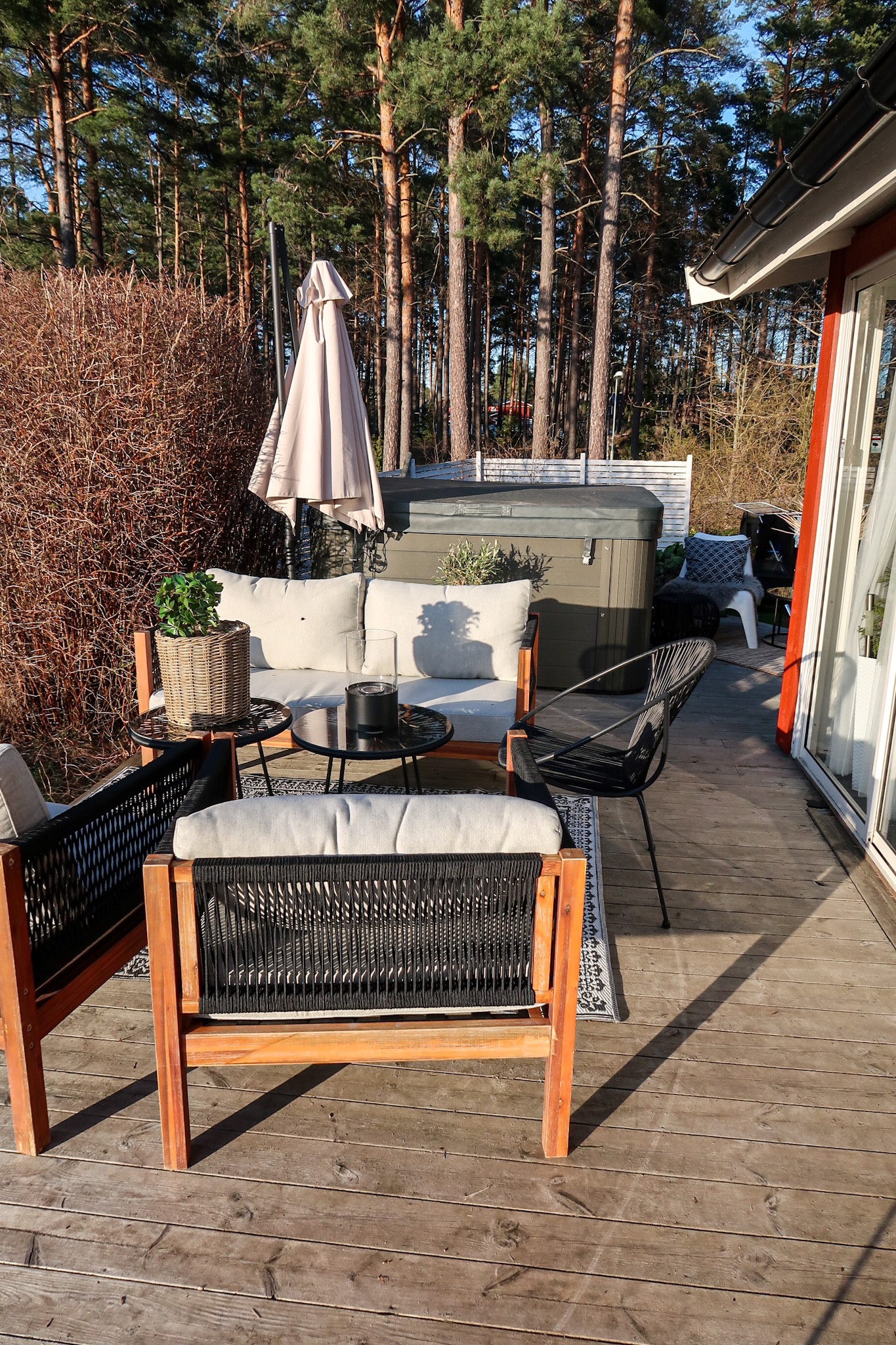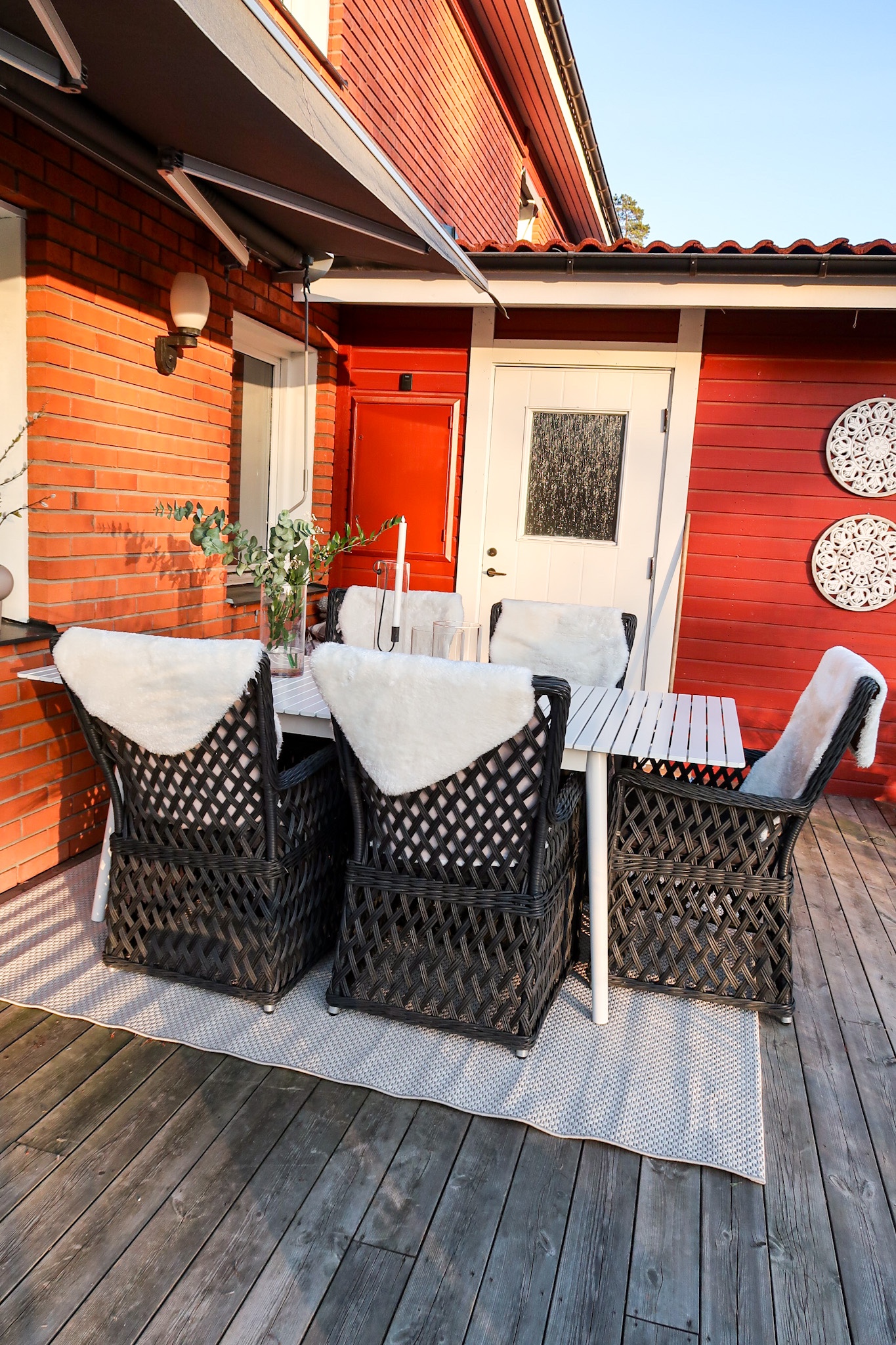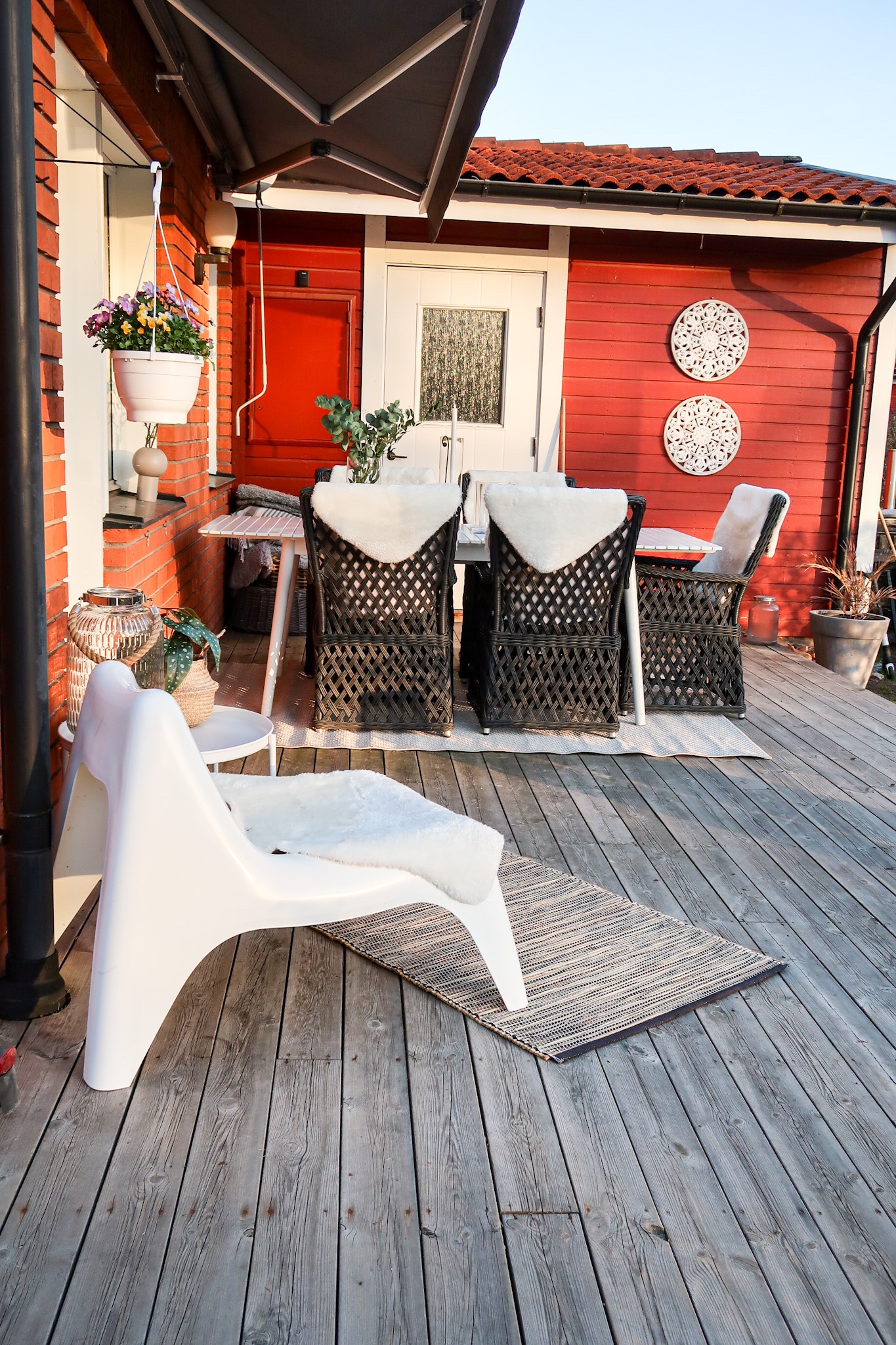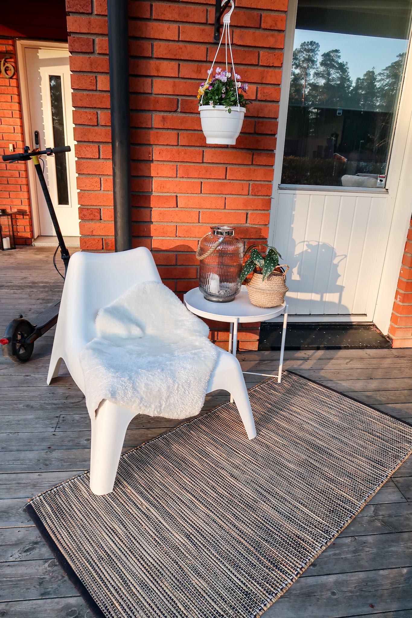 Gjorde en liten mysig sitthörna vid bordet också. Här gassar solen in från eftermiddag, här satt jag igår i solen och stormtrivdes. Ett tips till dig som vill fylla ut altanen och göra det lite mysigare är att göra exakt såna här små sittplatser. Tänk matta, skön stol, ett litet bord och kanske någon dyna eller pläd så blir det hur mysigt som helst. Mattorna är för utomhusbruk, viktigt att tänka på.