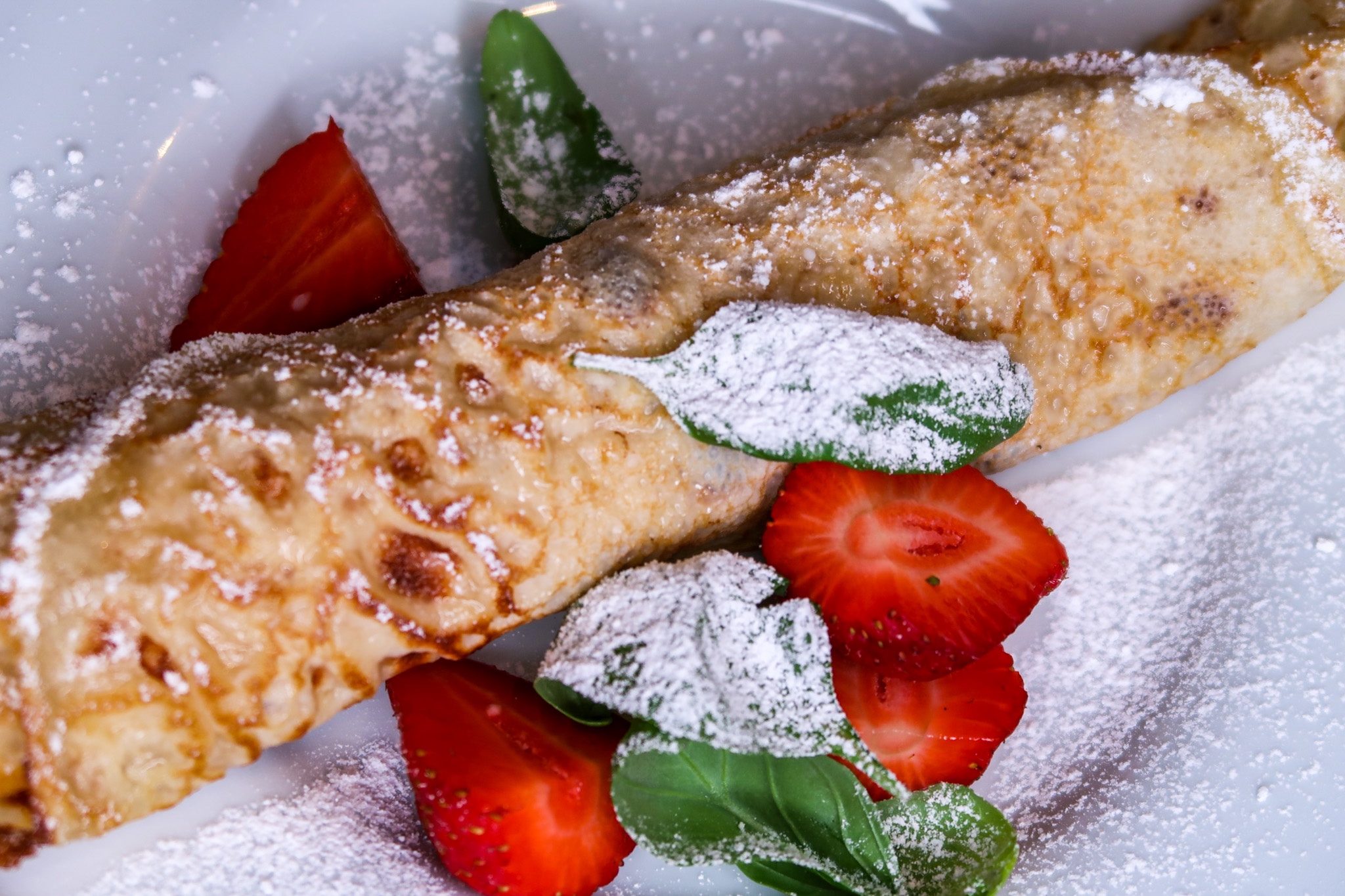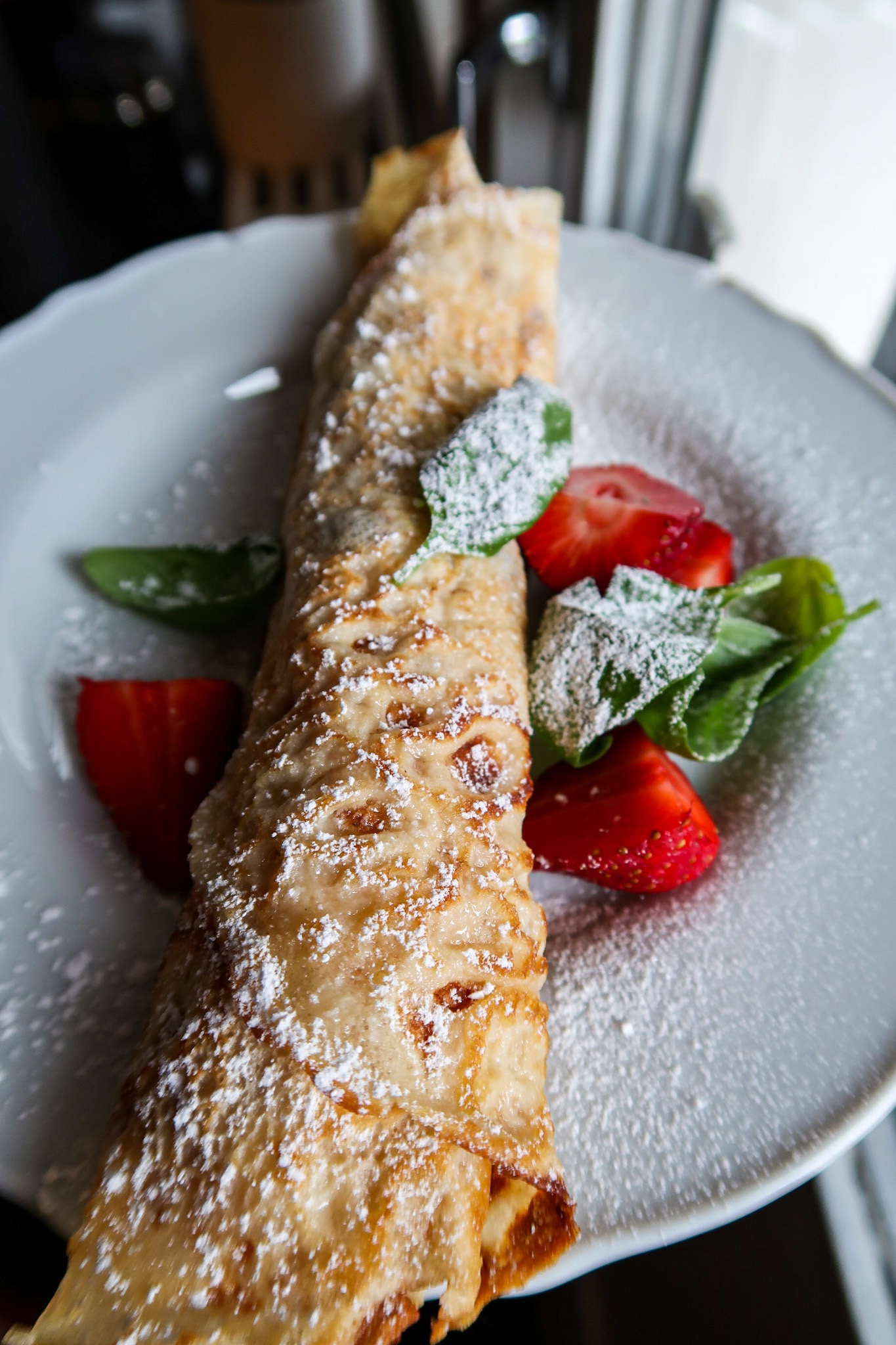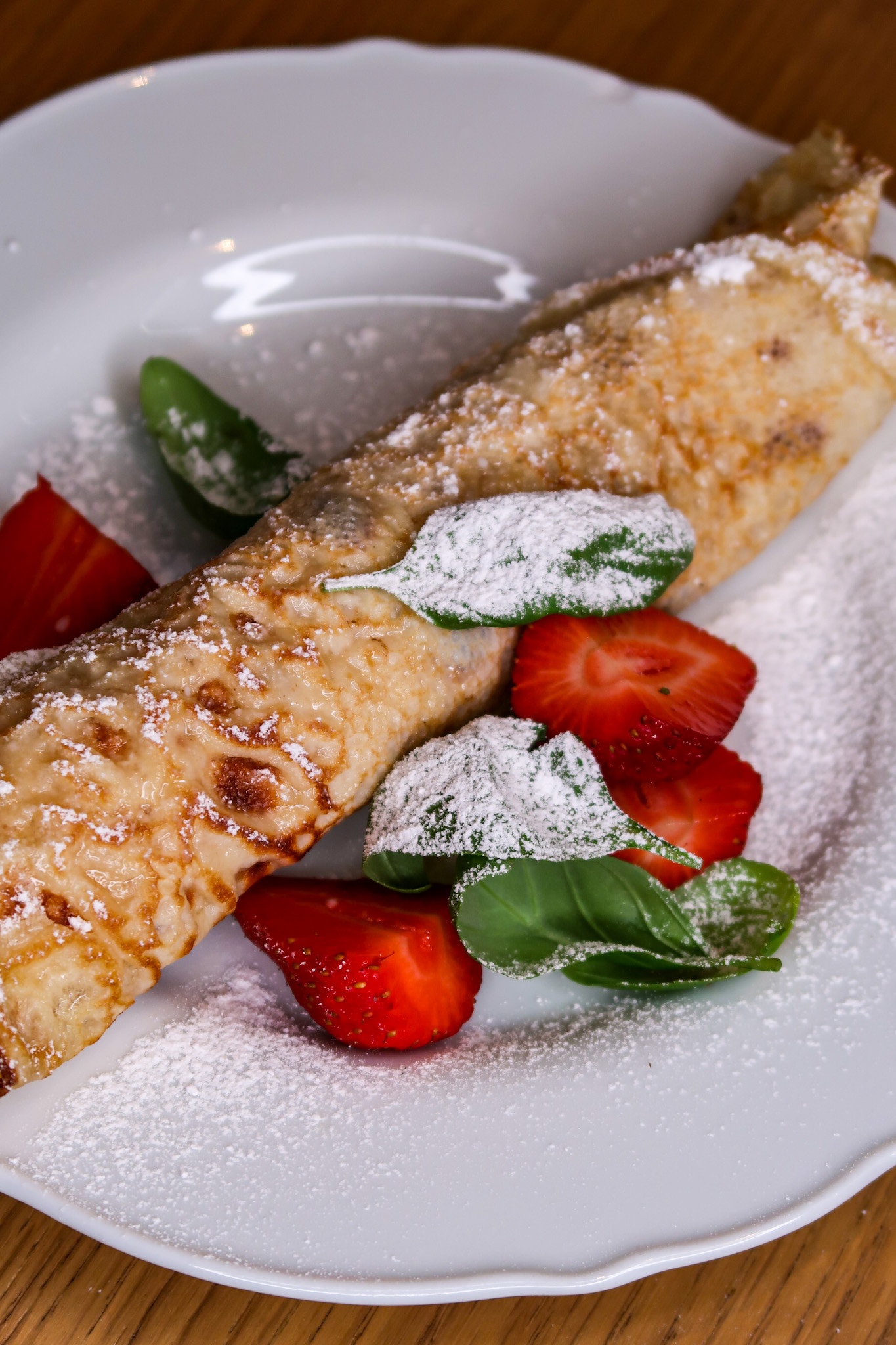 6) Fyll pannkakorna och rulla ihop. Servera med jordgubbar och basilika med florsocker uppepå.