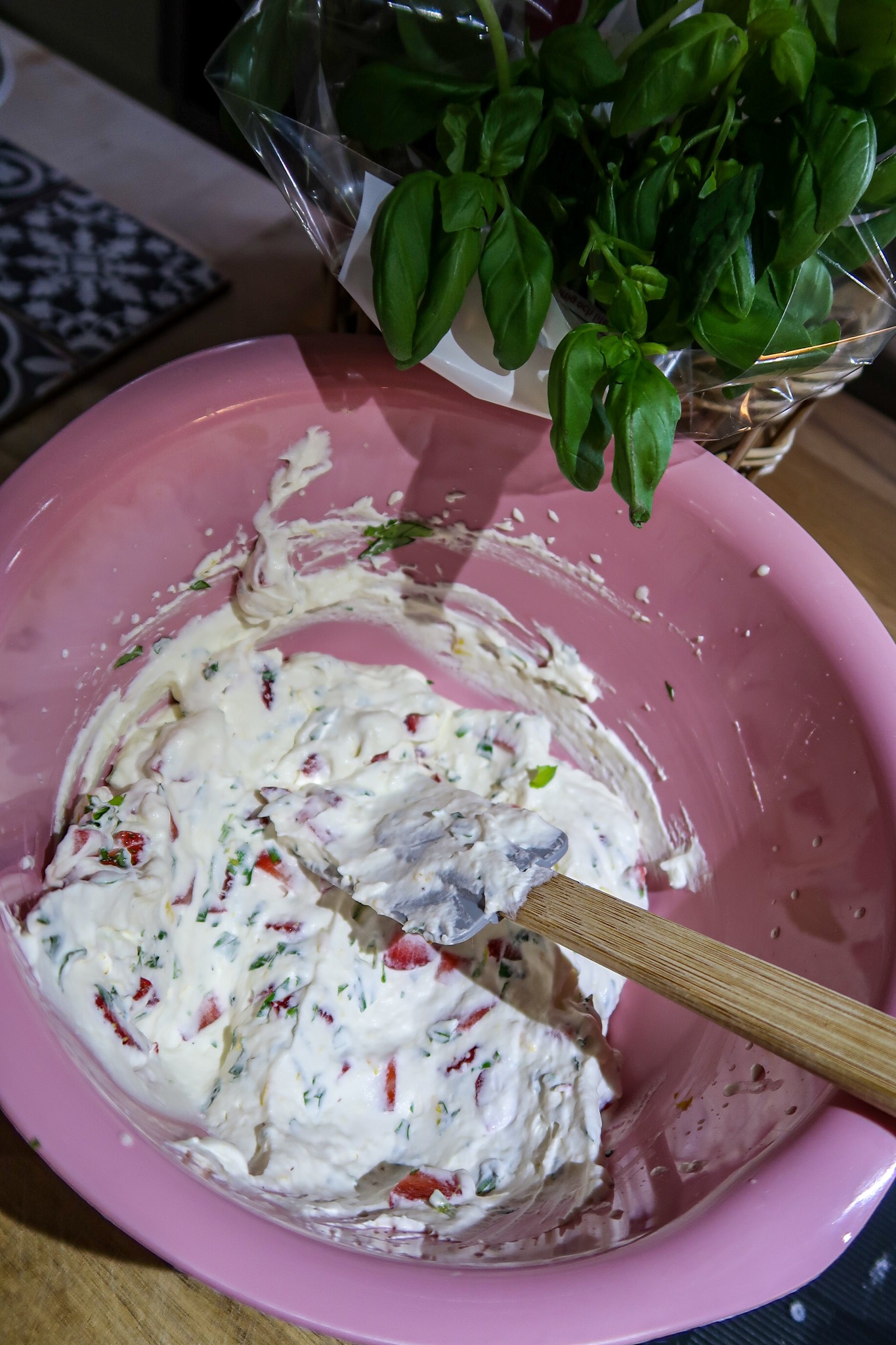 5) Vispa grädden. Ha i marmeladen, vispa lite. Hacka jordgubbar och basilika och ha i det, avsluta med vaniljsocker. Rör runt med slickepott.