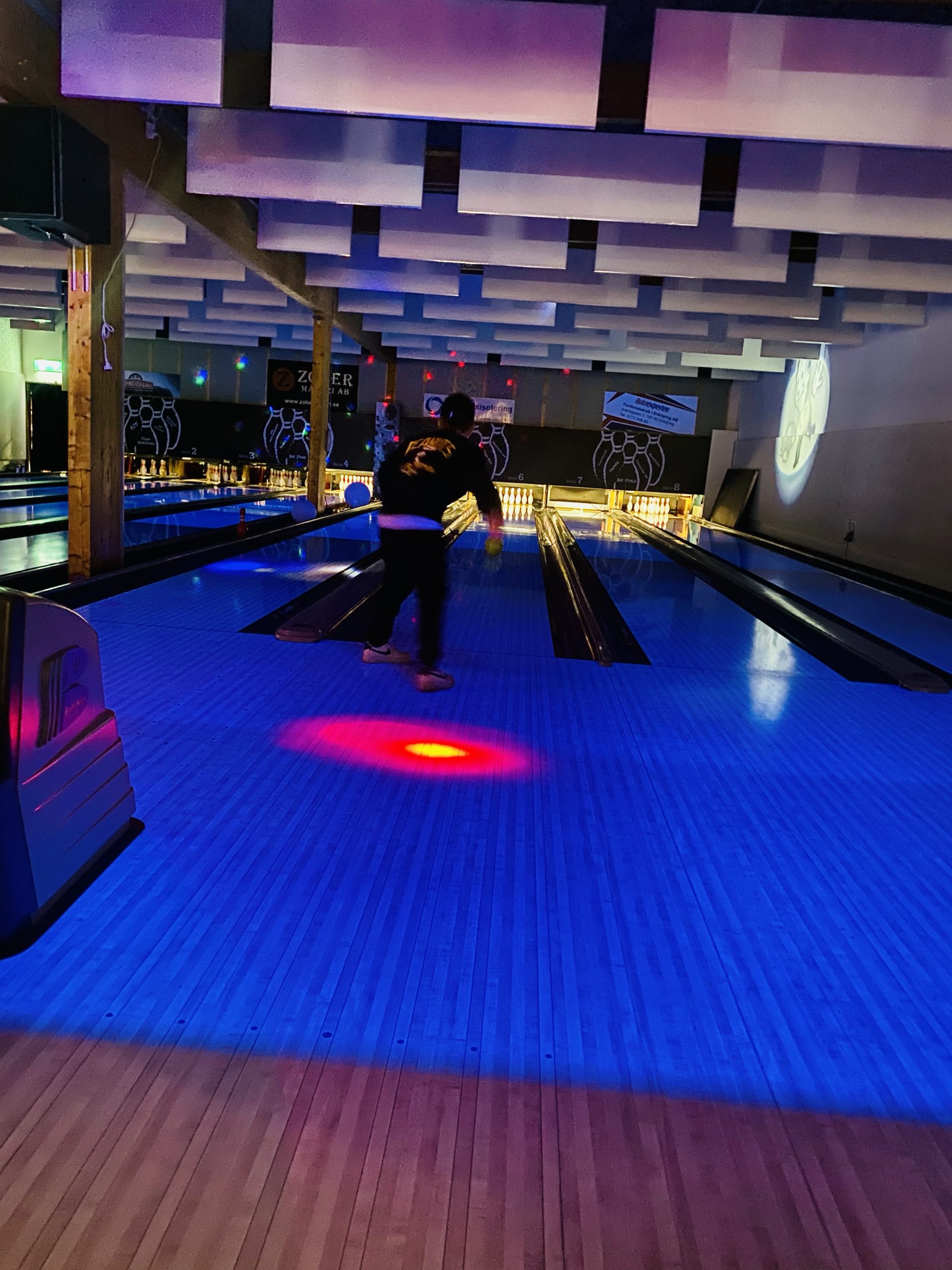 Det fanns inga storlekar kvar av bowlingskorns så snacka om att vi fick oss ett gott skratt när Milo stövlade på sig storlek 50 på bowlingskorna.