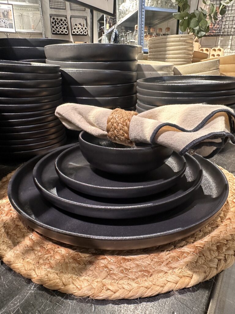 De här tallrikarna (<klicka) var också så snygga! Såhär är det ju verkligen supersnyggt att duka, stod och fingrade på servettringarna (<klicka), ångrar nu att jag inte köpte dom. Så snyggt, får lägga en beställning tror jag. Bordsunderläggen (<klicka) till var pricken över i:et. Bomullsservetterna (<klicka) med svart kant – wow!