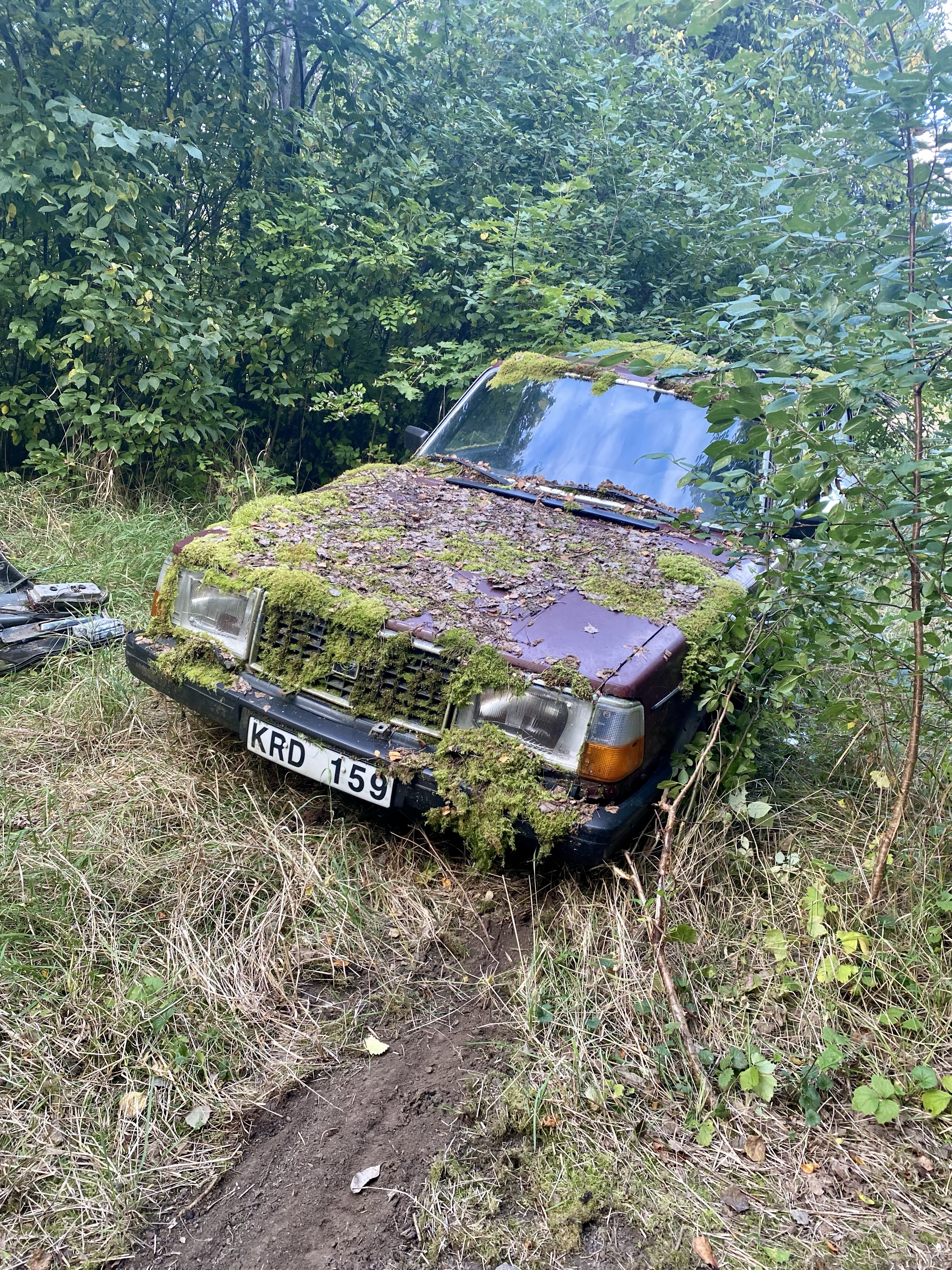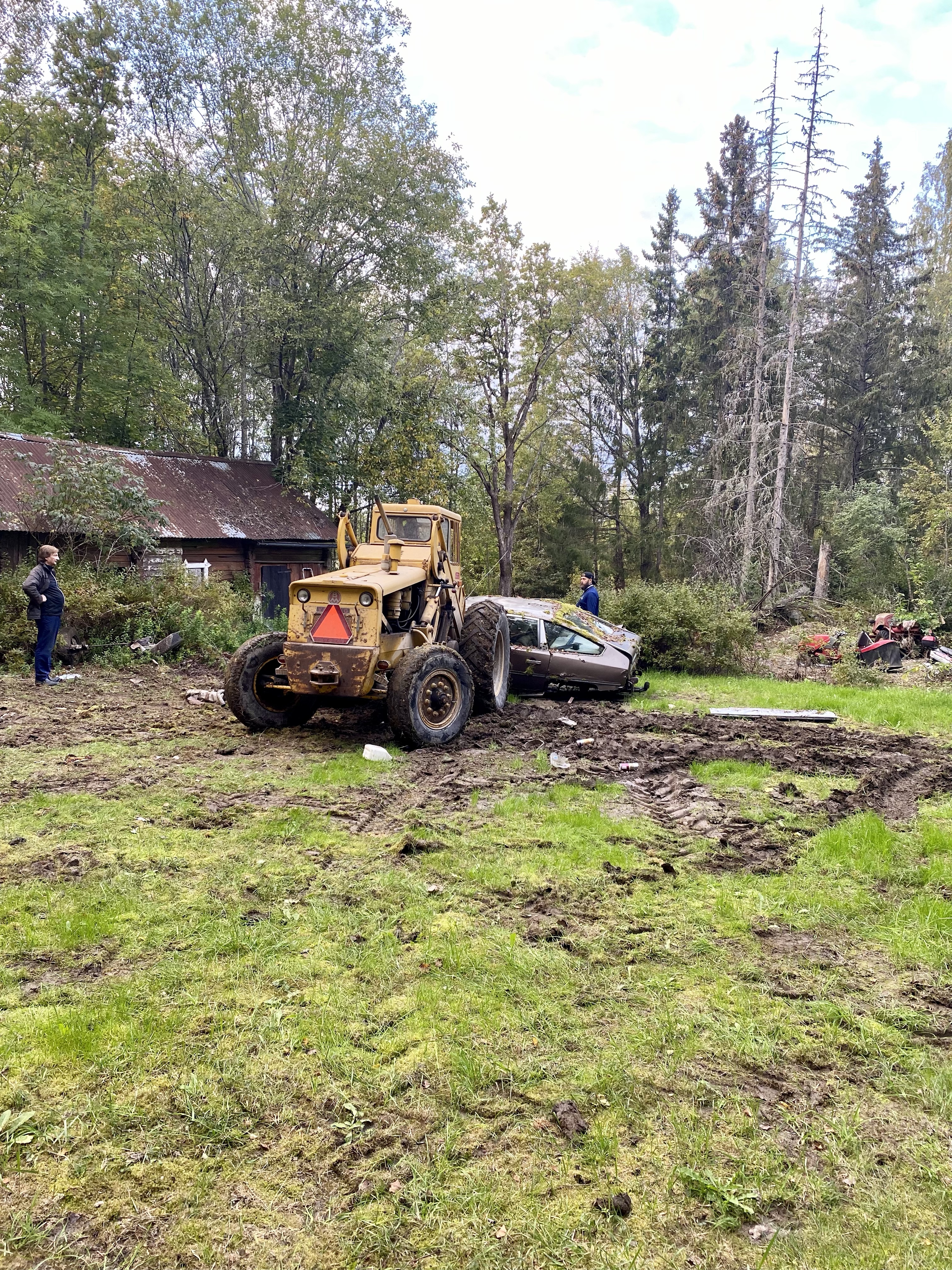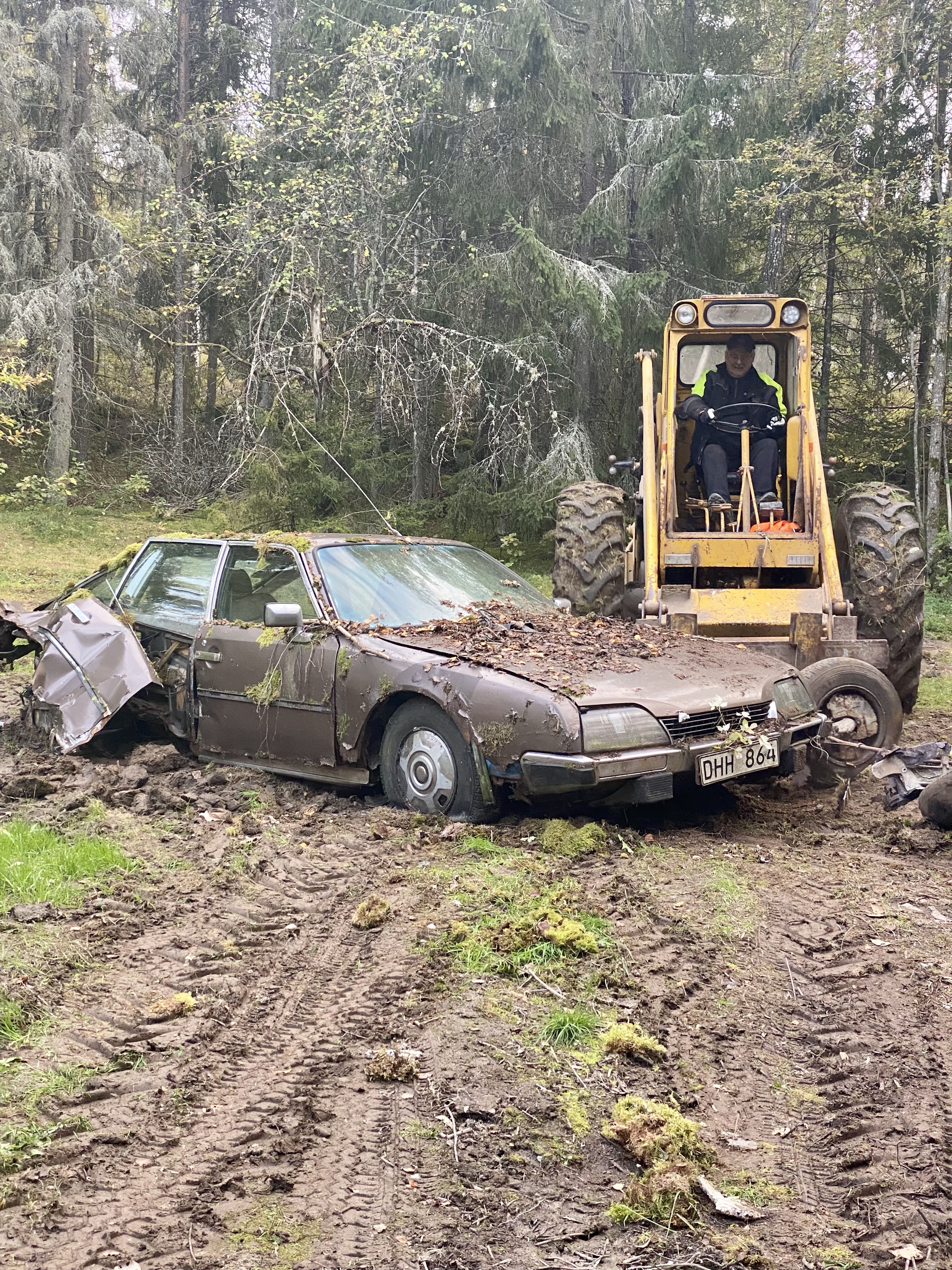 Väl därute så fick vi se en väldigt nöjd svärfar som fick husera runt med den här hjullastaren. Intill deras gård finns en till gård som numera är Tonys brors. Där håller de nu på att röja undan massa bilar som stått och samlat på sig mossa. Japp, du läste rätt. Mossa växer på bilarna, så du kan ju tänka dig hur länge de stått!