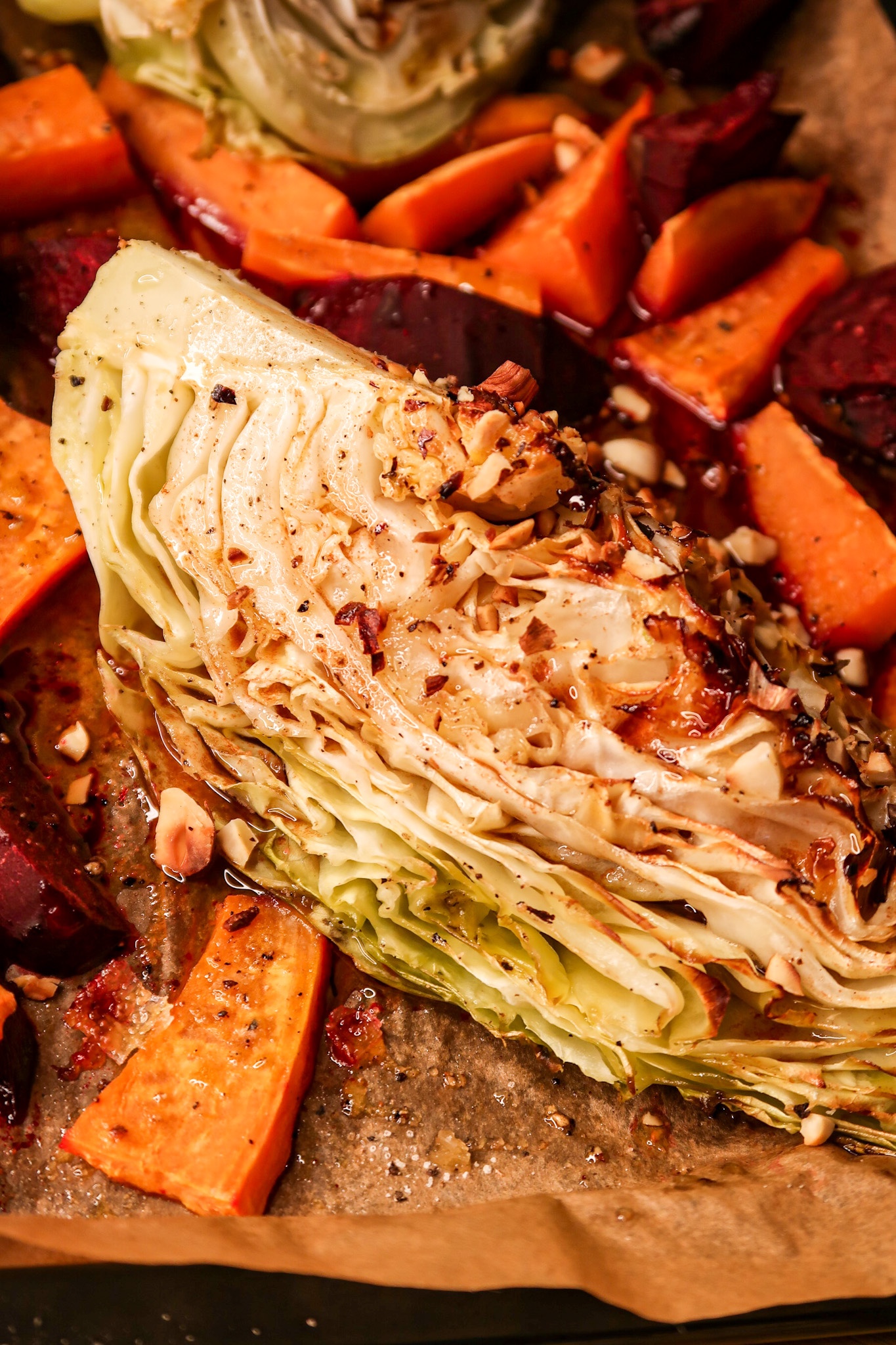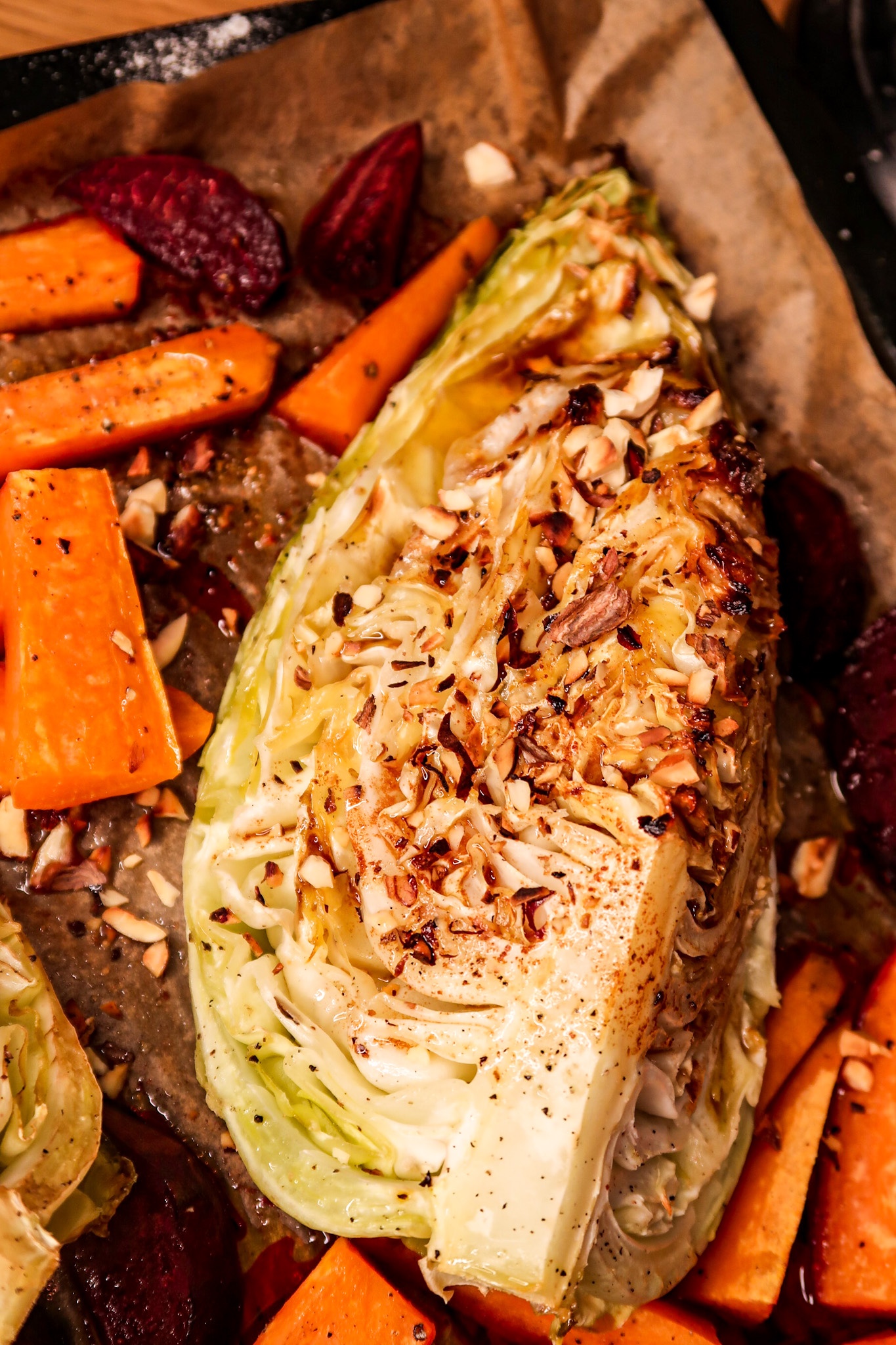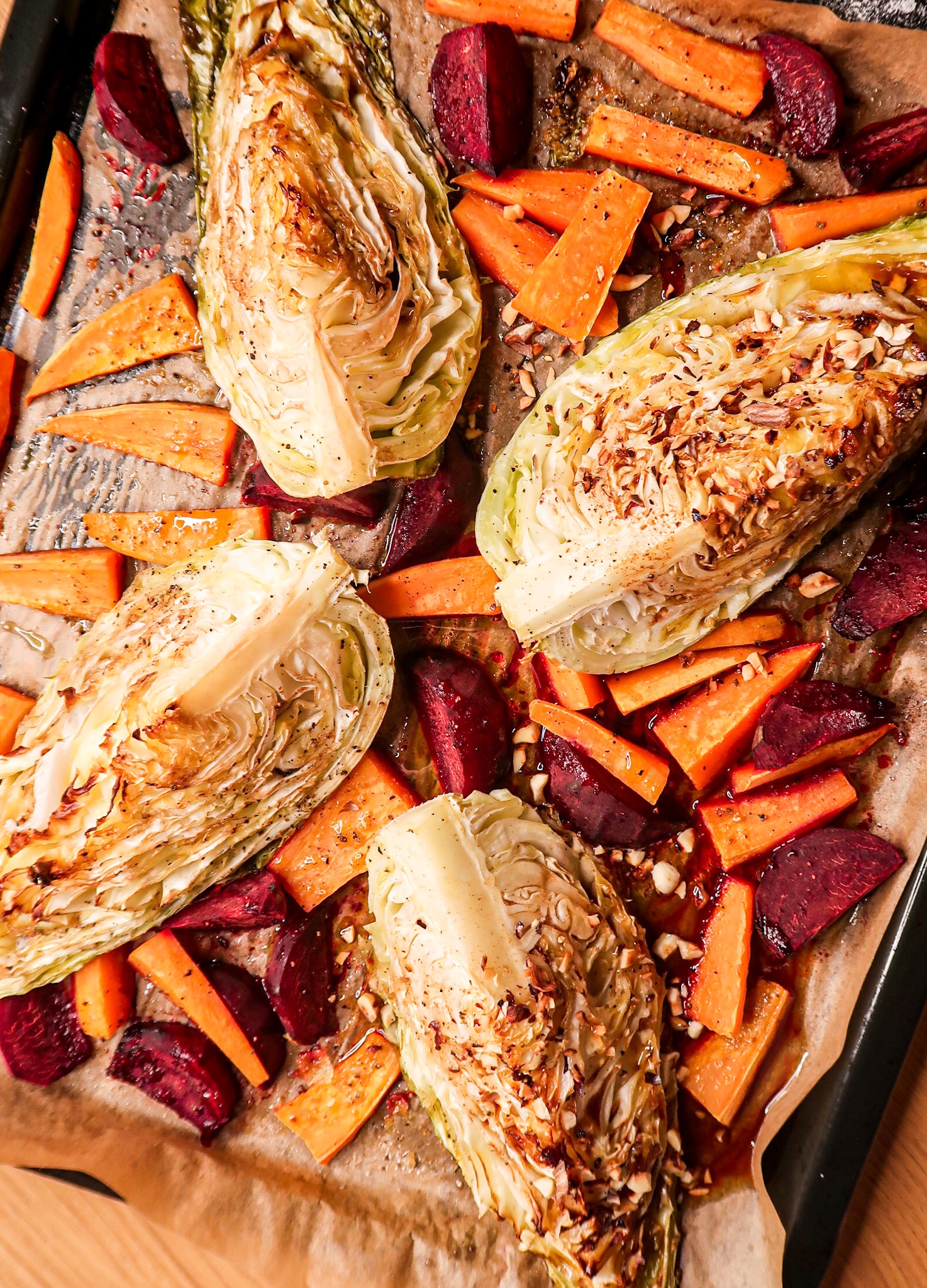 1) Sätt ugnen på 200 grader. Lägg bakplåtspapper på en ugnsplåt. Dela spetskålen i 4 delar. Skala sötpotatisen och rödbetorna. Dela dem i klyftor. Lägg allt på plåten. Ringla över olivolja och strö på salt & peppar. In i mitten av ugnen i ca 30 minuter.