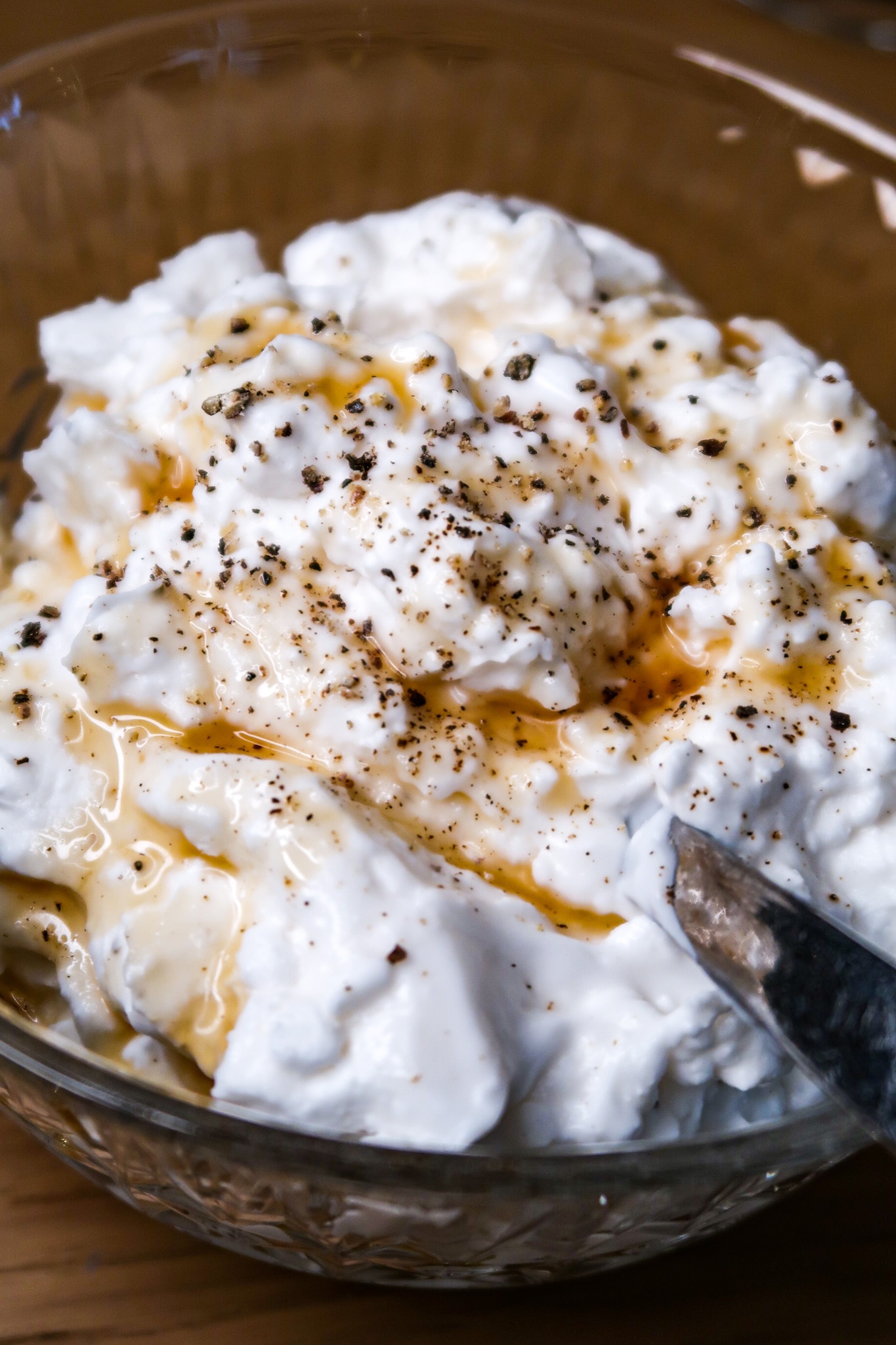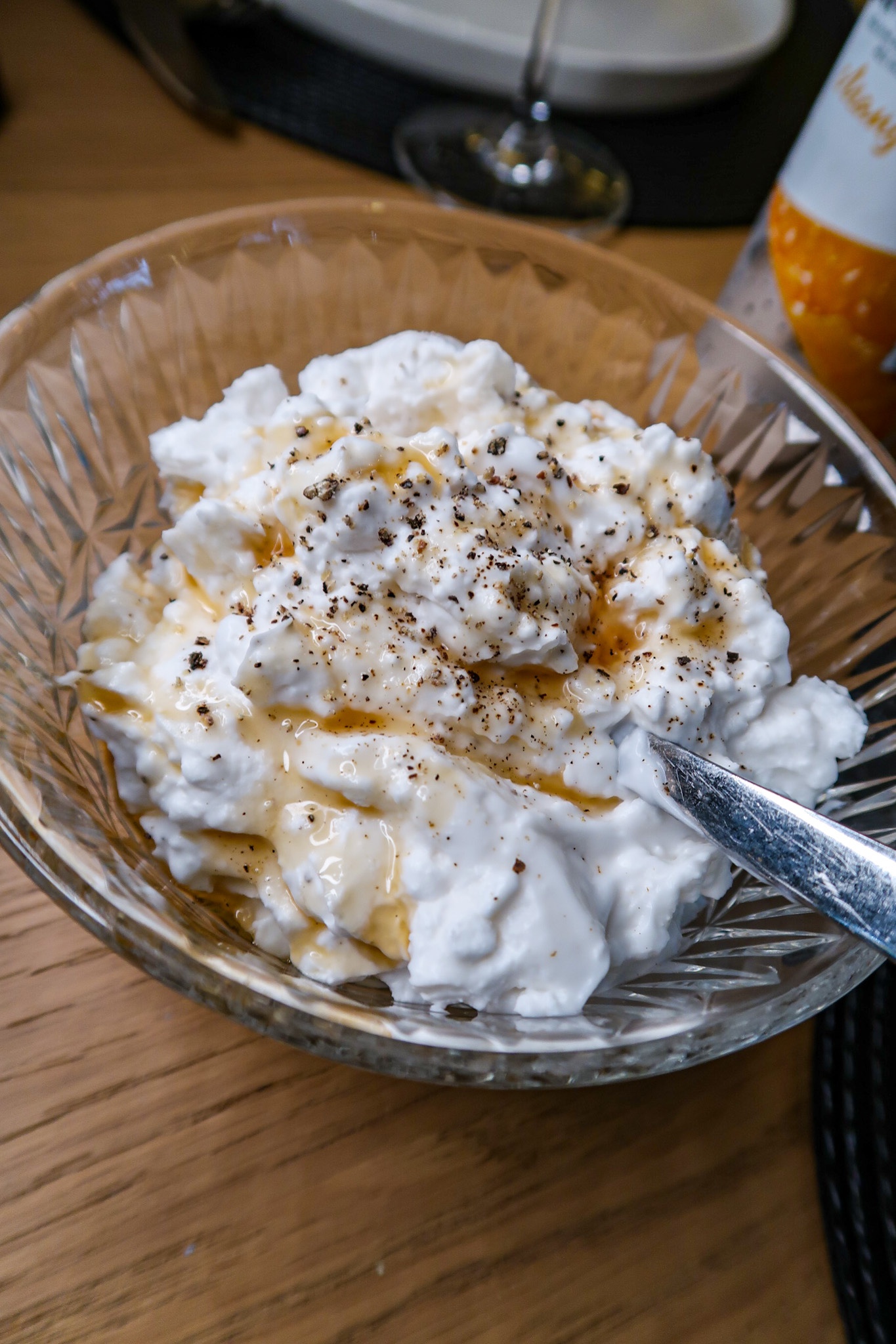 2) Fetaostkrämen: Smula ned fetaosten i en skål eller bunke. Ha i yoghurt, honung och salt & peppar. Ringla över lönnsirap och snurra på lite svartpeppar just innan servering.