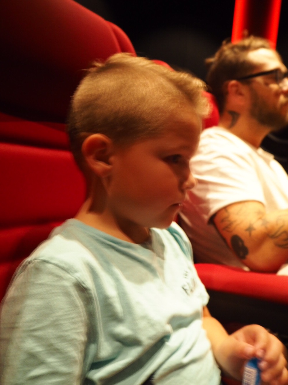 Suddig bild…. Milo var så himla spänd innan filmen. Han fick se en trailer på Bilar 3 innan vi åkte och där får man se hur illa Blixten McQueen kraschar.