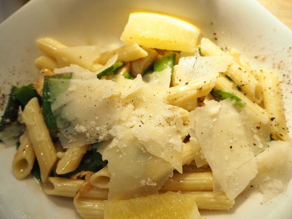 Jag tog en glutenfri kycklingpasta med citron och massa parmesan. Alltså parmesan!!!! Jag skulle kunna äta parmesan på allt! På glassen, på potatis, på tårtan….ja men högt och lågt. Det är så sjukt gott. Å jättenyttigt! Eeeeh….