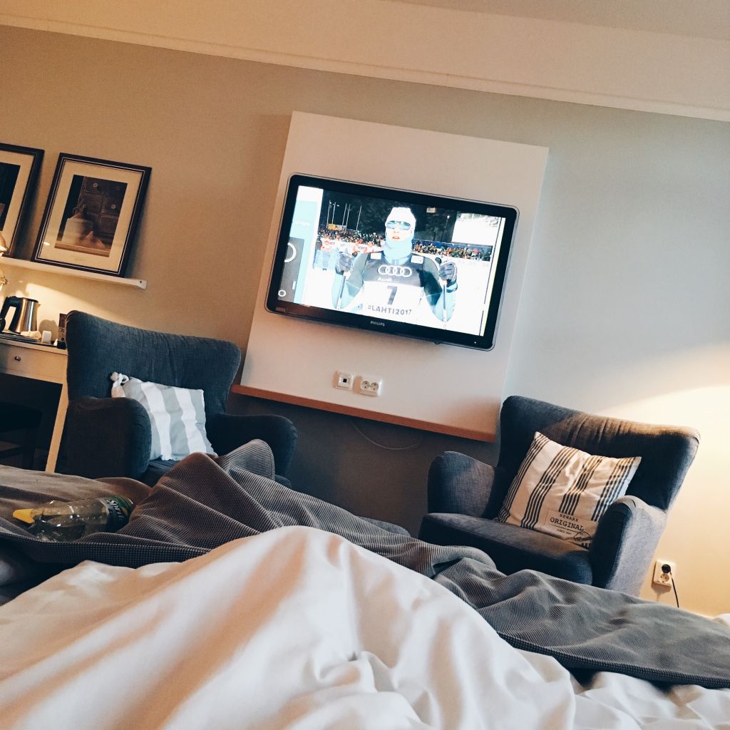 Ligger här under täcket och tittar på skidorna. Äääääälskar att kolla på skidåkning faktiskt. Det MÅSTE vara Jakob Hård och Anders Blomquist som kommenterar, då är det skidor på riktigt!