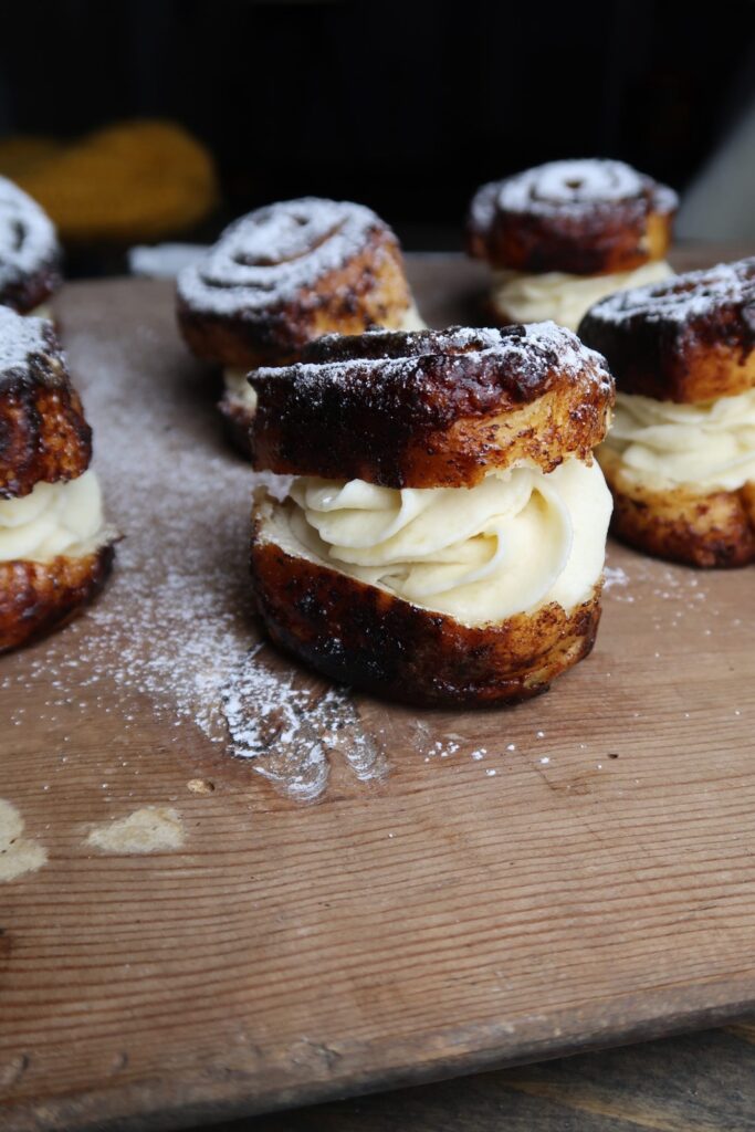 Äpple & kanel: Lägg några tunna skivor äpple i stekpannan innan du steker bullarna…kanel, smör och äpple är en drömkombo. Lägg sedan äppelskivorna på mascarpone fyllningen – himmelskt!