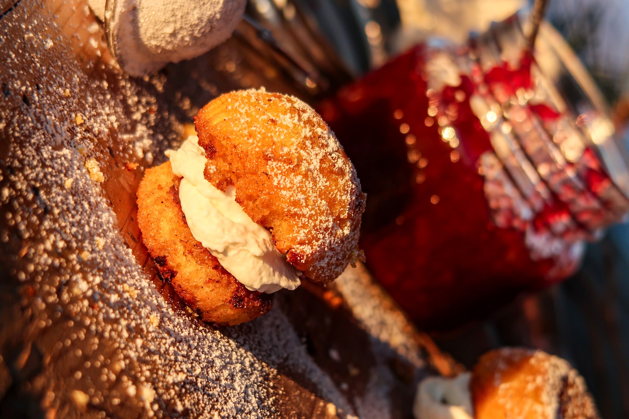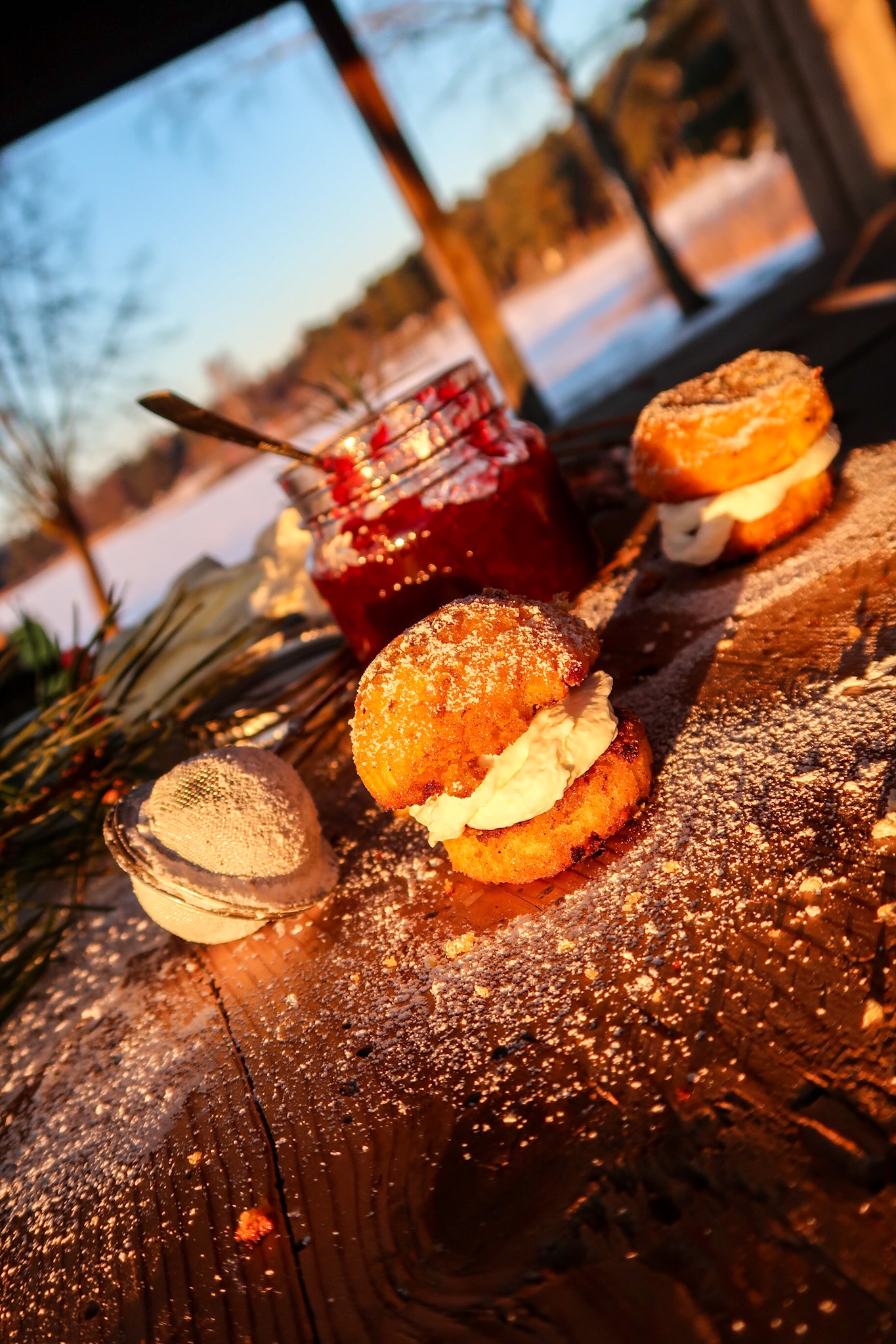 7) Ha i rörda lingon på bottendelen, på med grädde och sen på med toppen. Dofta över lite florsocker. Ät & njut!