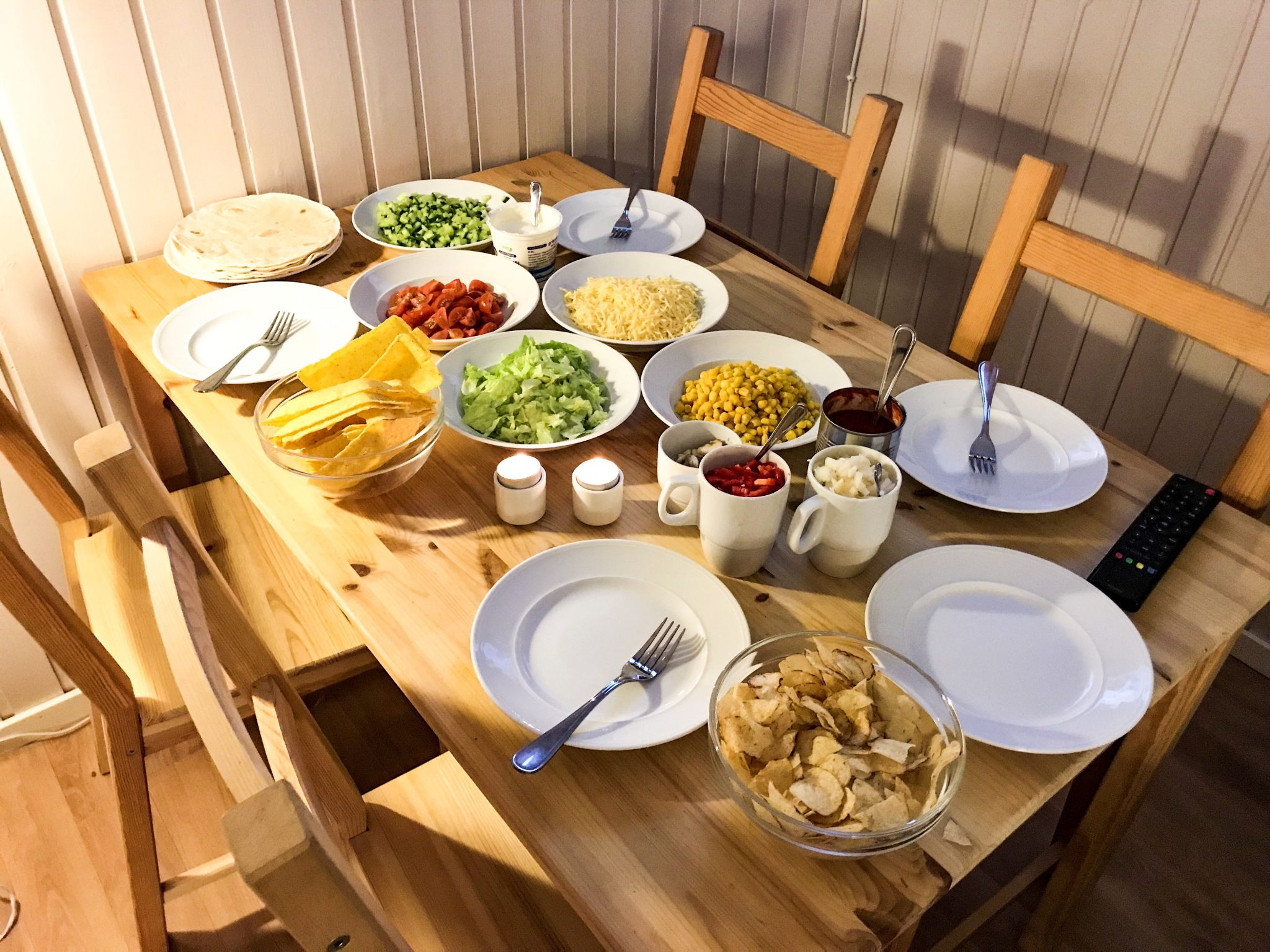 Igår kväll hade vi taco-kväll här i vår lilla stuga. Varenda lite pinal av bytta, glas och mugg användes i det lilla köket för att kunna servera tacosen. Ser ni att jag använde äggkopparna som ljushållare?