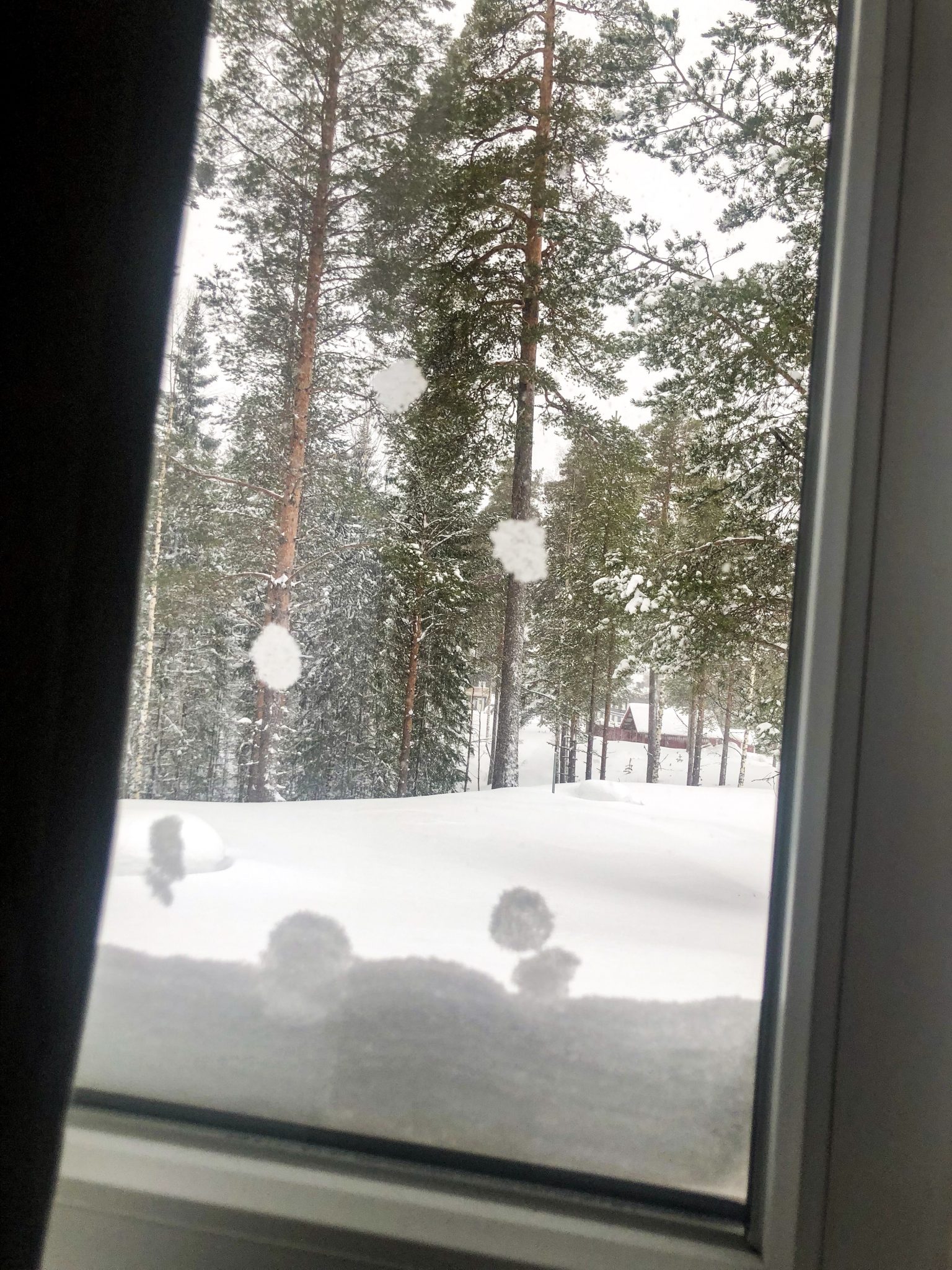 Vädret är inte det bästa idag heller. Snön yr lite och det är mulet, rätt mysigt och sitta här i stugan med myskläderna faktiskt. Får se när vi ger oss ut i backen idag?
