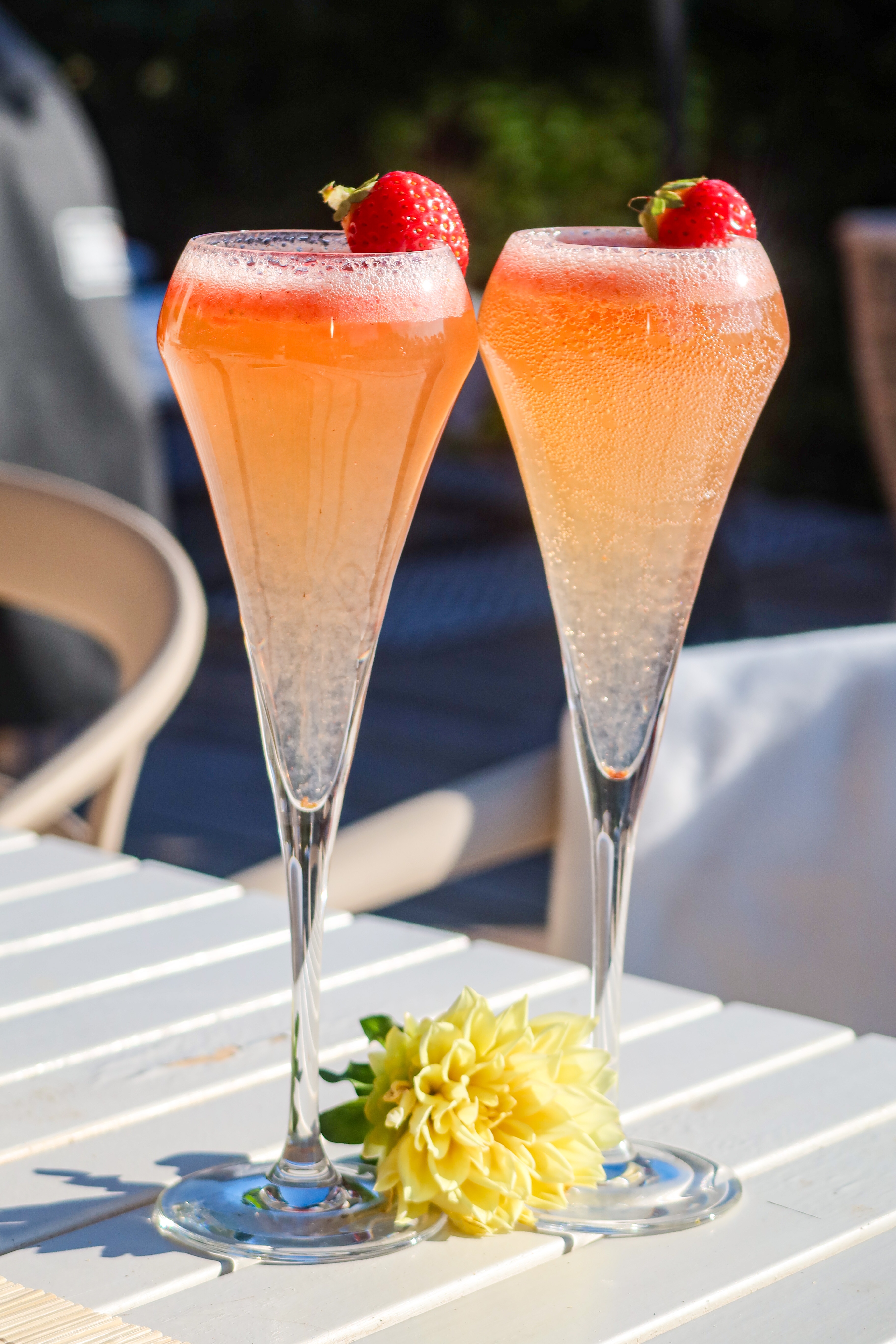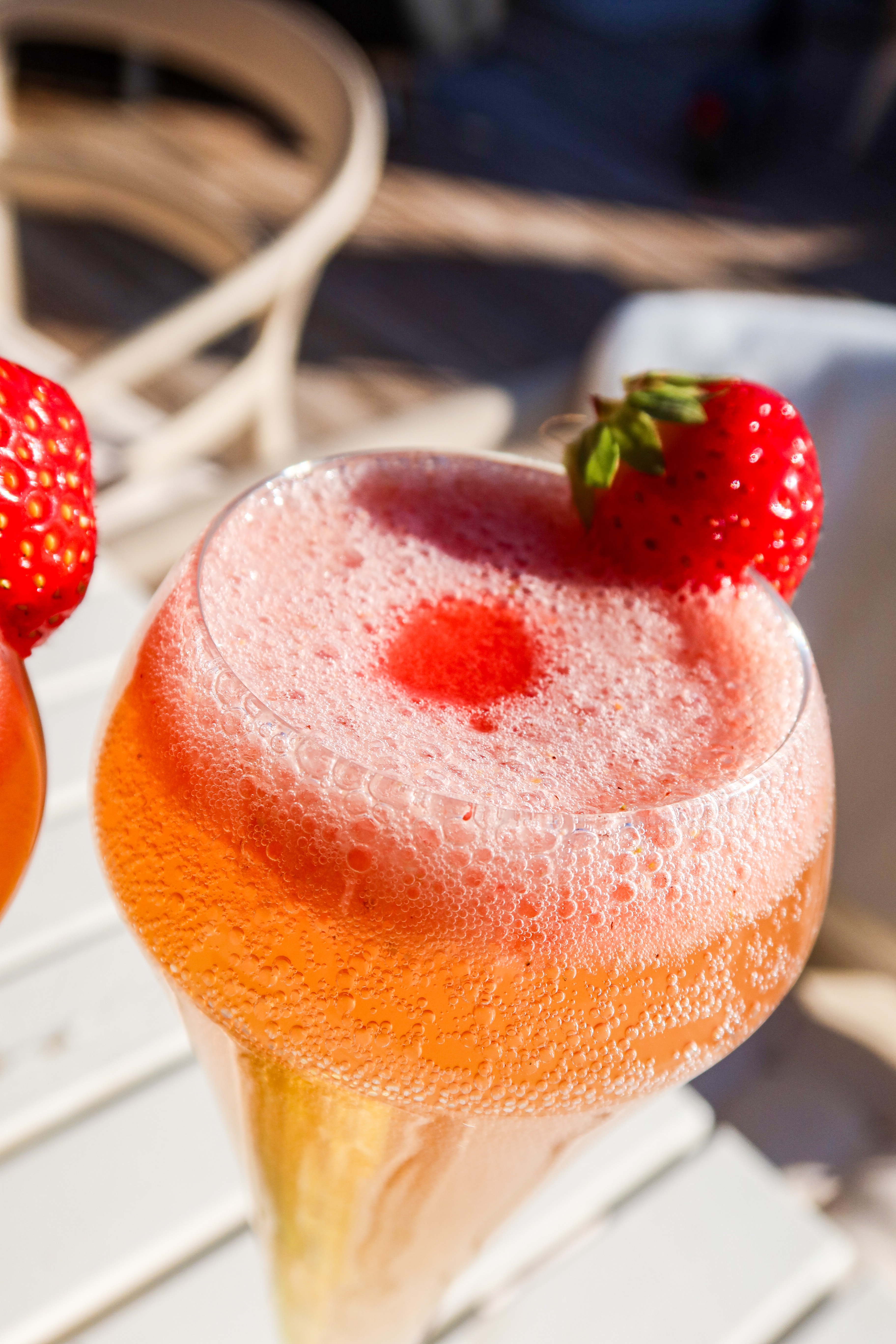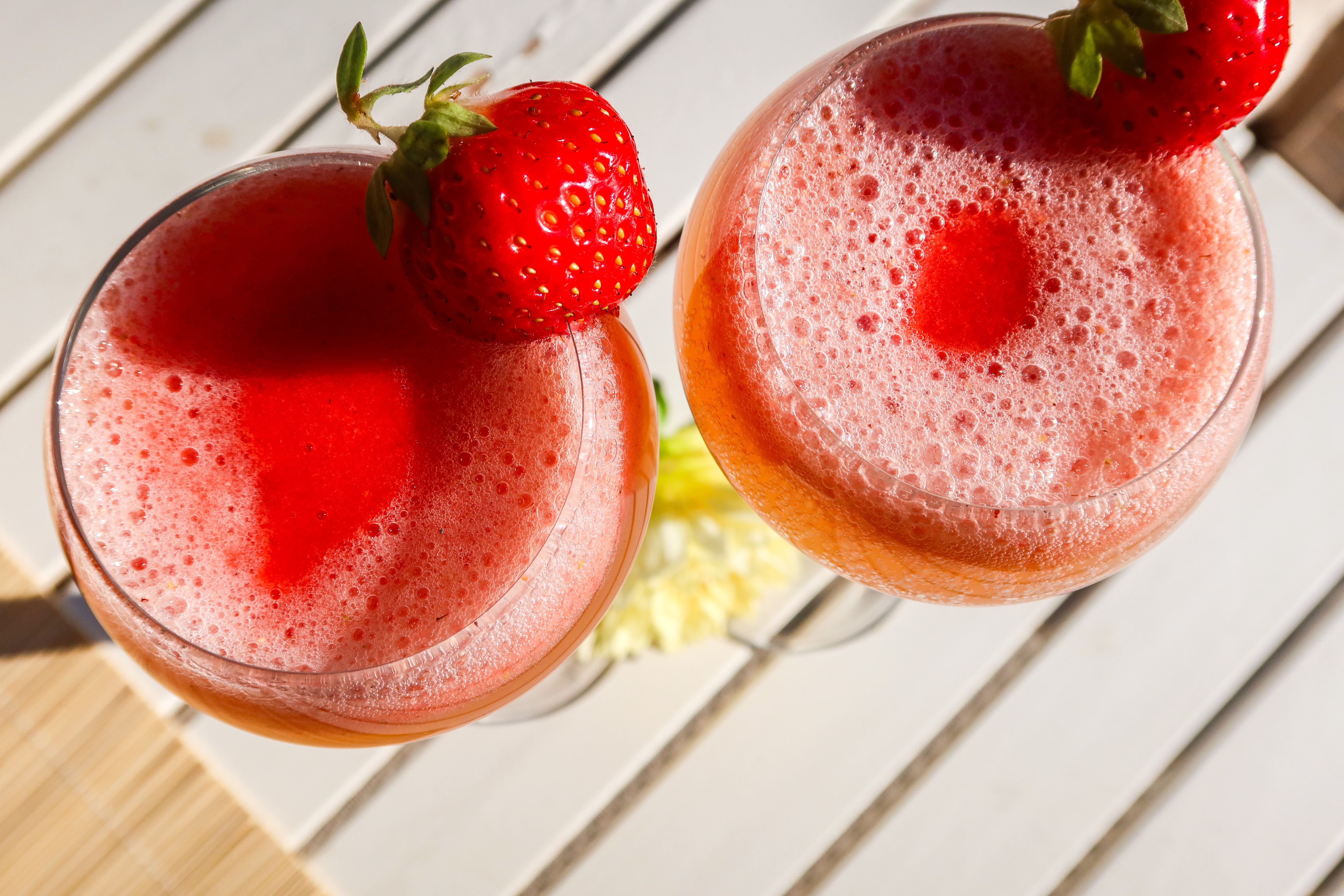 2) Häll i fyra glas och toppa med mousserande, med alkohol eller utan. Rör runt lite med en sked. Häll en liten slatt av jordgubbspuren högst upp. Dekorera med en jordgubbe.