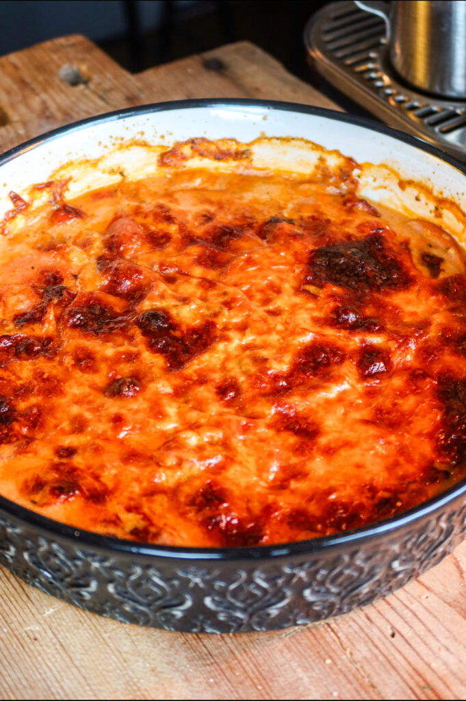Såhär ser korven ut när du tar ut den från ugnen. Såsen ska ha bubblat upp ordentligt på sidorna och osten ska ha fått rejält med färg.