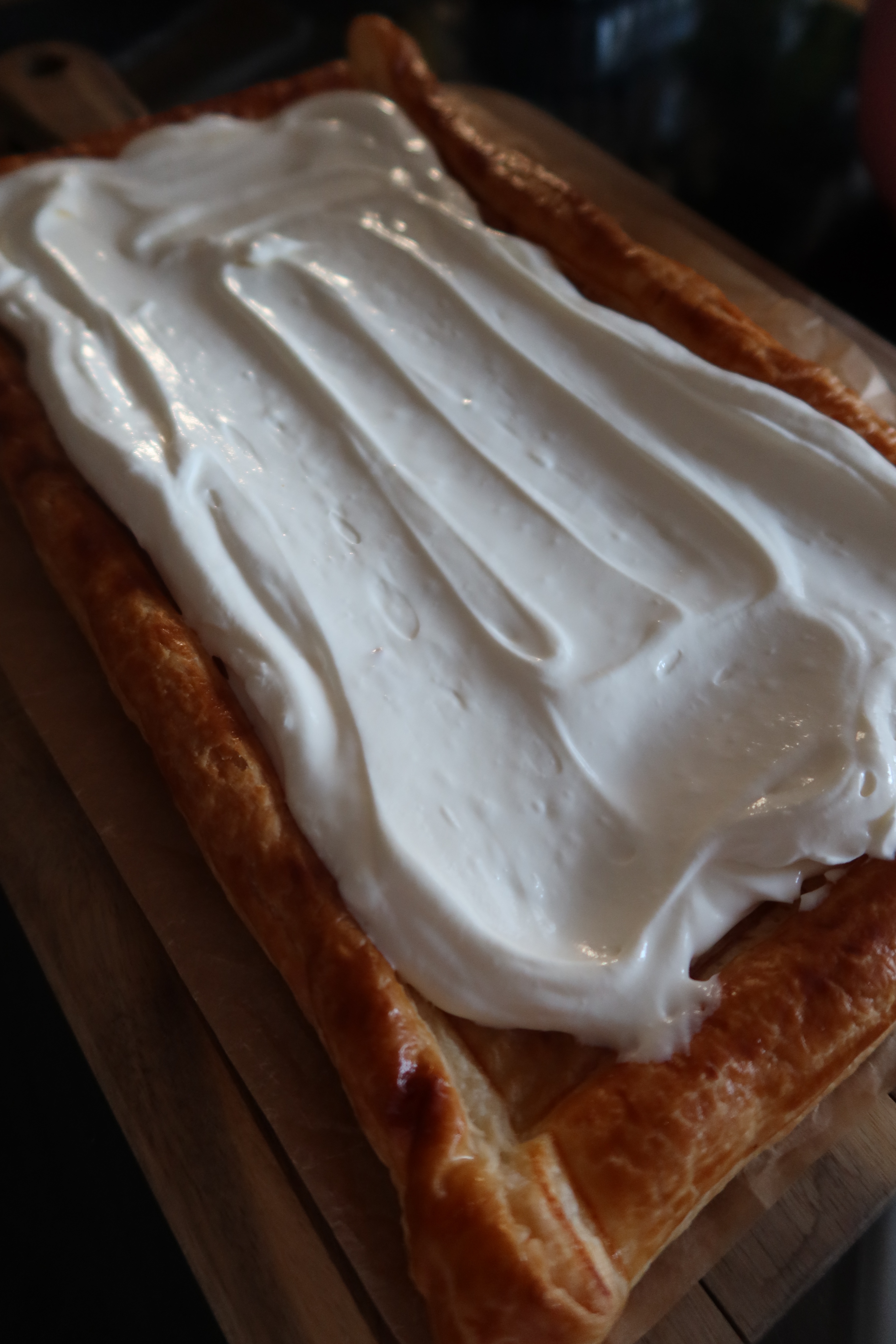 2) Vispa samman färskost, grädde, florsocker, citron och vaniljsocker. Det ska bli en fluffig kräm. Bred på den på smördegsplattan.