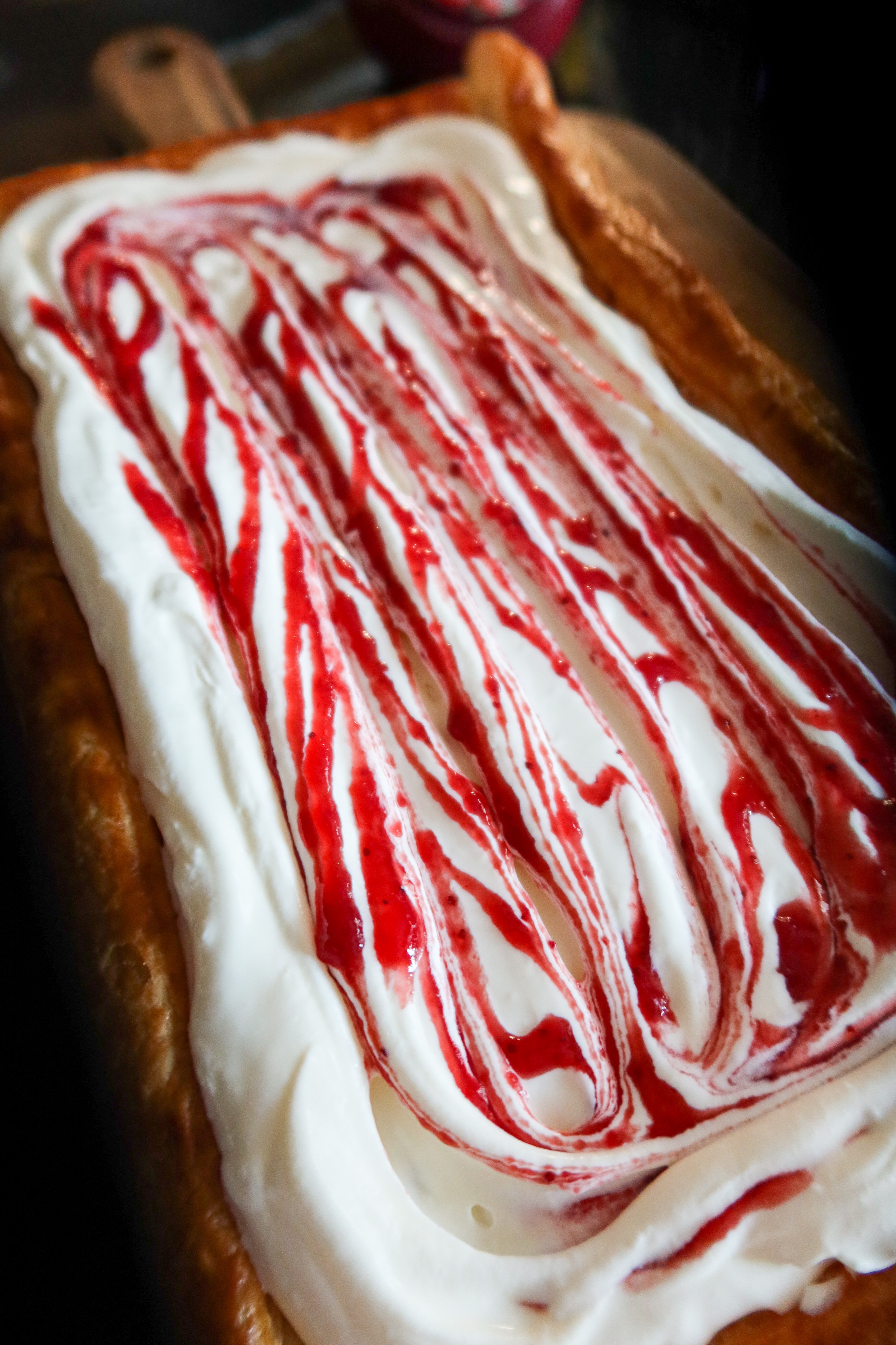 4) Dra med en sked så det blandas ordentligt över färskostblandningen.